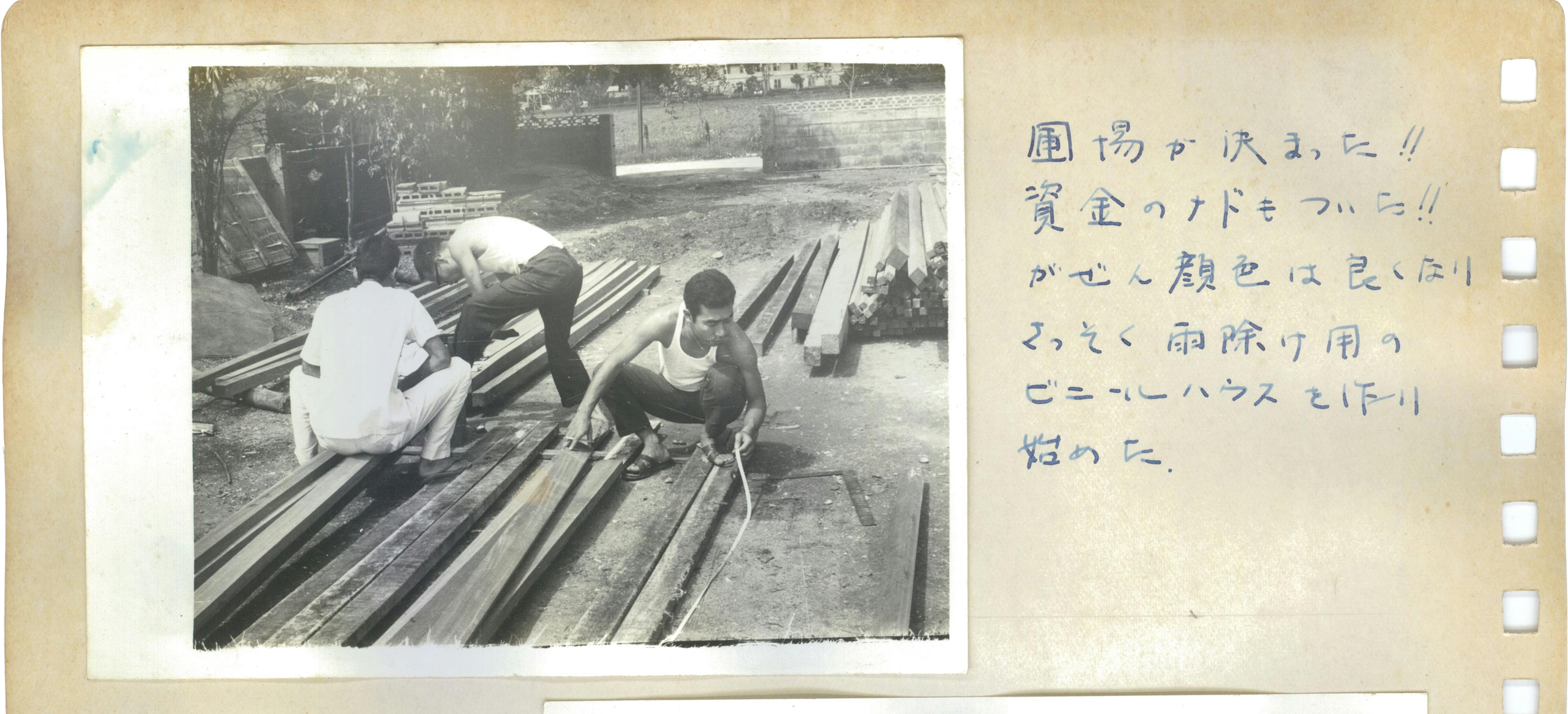拠点が決まり取り掛かったのは、雨期の野菜栽培に悩まされていた住民のため、雨よけのビニールハウスを設置すること。写真には、やっと本格的に活動できる喜びに溢れた、手書きのメモが添えられている。