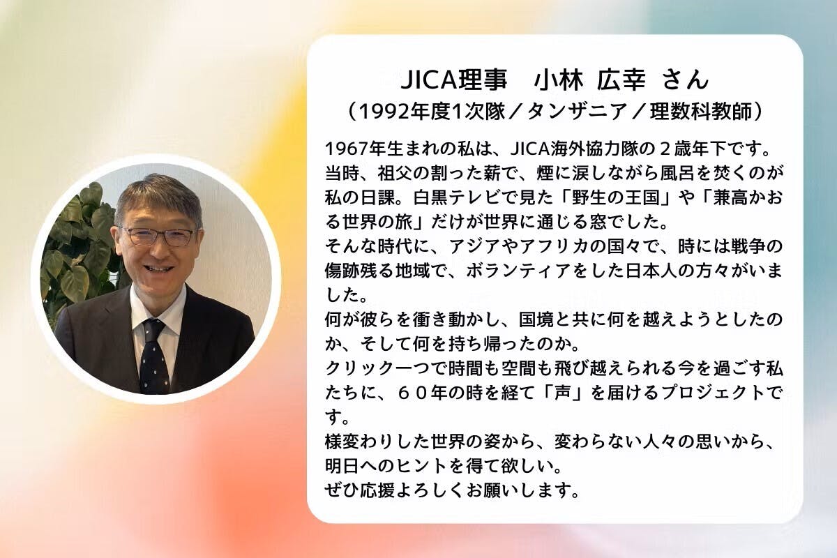 「1967年生まれの私はJICA海外協力隊の2歳年下です。当時、祖父の割った薪で、煙に涙しながら風呂を焚くのが私の日課。白黒テレビで見た「野生の王国」や「兼高かおる世界の旅」だけが世界に通じる窓でした。そんな時代に、アジアやアフリカの国々で、時には戦争の傷跡残る地域で、ボランティアをした日本人の方々がいました。何が彼らを衝き動かし、国境と共に何を越えようとしたのか、そして何を持ち帰ったのか。クリック一つで時間も空間も飛び越えられる今を過ごす私たちに、60年の時を経て「声」を届けるプロジェクトです。様変わりした世界の姿から、変わらない人々の思いから、明日へのヒントを得て欲しい。応援よろしくお願いします。」