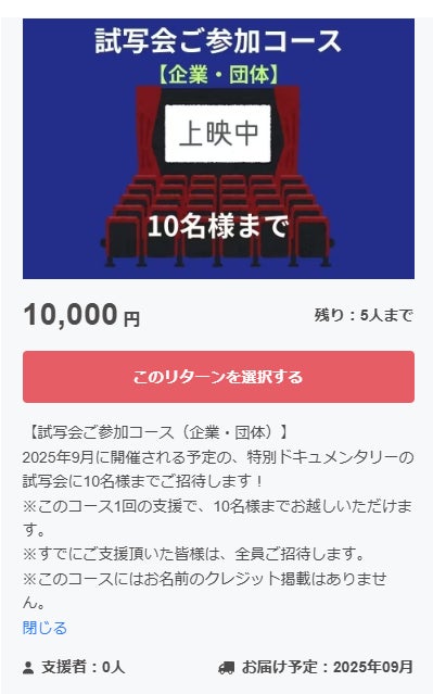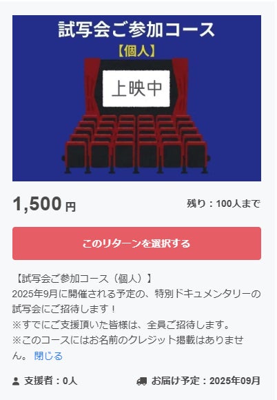 追加したリターンはどちらも2025年9月に東京で開催するドキュメンタリー完成試写会へのご招待となっております。なお、試写会の後には懇親会も開催予定です。さらに、遠方にお住まいなどで当日お越しになれない方々のためにオンライン配信も現在検討中です。
