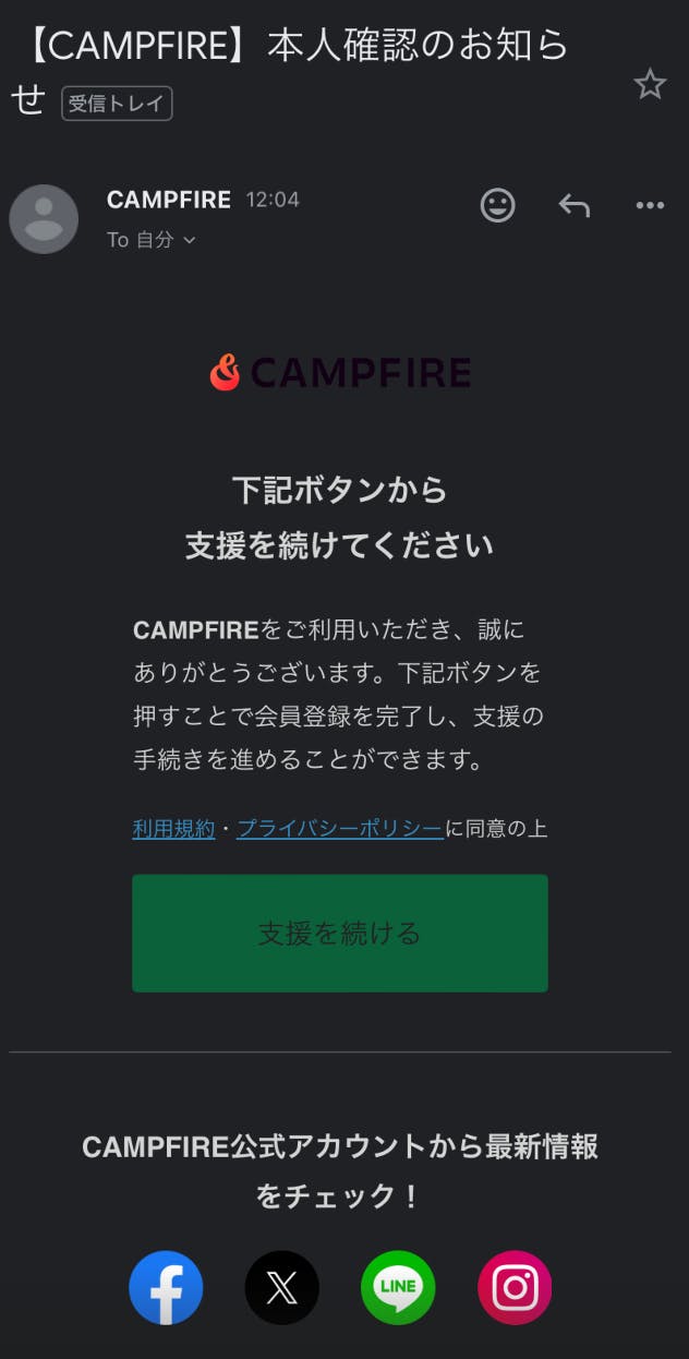 ⑥入力したメールアドレスに届く「本人確認のお知らせ」メール内の「支援を続ける」を選択