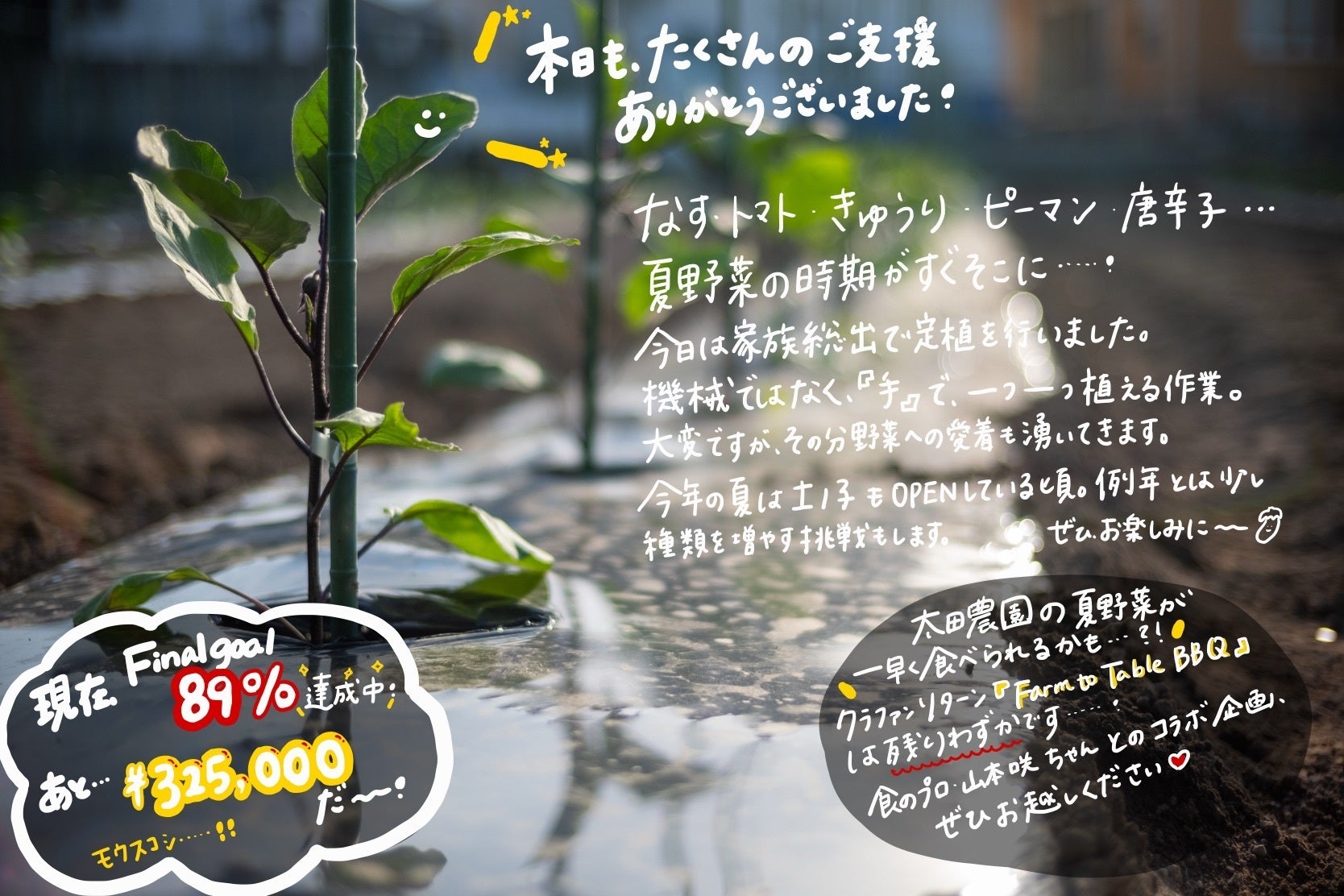 土ノ子のクラウドファンディングにご支援いただいた皆様みなさまのおかげでFINAL GOALである¥3,000,000を本日達成することができました。心から、ありがとうございます。約280名の方からいただいたご支援と温かいコメントを忘れず、土ノ子OPENに向けて明日からも頑張ります。引き続き、見守っていただけたら嬉しいです。今日も、夏野菜の定植を行いました。今日はピーマン。これで残すところ、あとはトウガラシのみ。明日植えます!こんなに植えて、今年の夏は大忙しになる予感…ですが、その頃には土ノ子でみなさんにお会いできると思うと、頑張れます。土ノ子に来ていただいた方が、また来たいと思ってもらえる場所にするべく、明日からも畑も土ノ子も、準備、全力で頑張ります引き続き、このCAMPFIREのメールからも、お店の情報などはご連絡させていただきます。あとは、太田農園(@otafarm.jp)および土ノ子(@tsuchi.no.co)のインスタグラムアカウントをチェックしていただけたら嬉しいです!改めて、この土ノ子クラウドファンディングに関わっていただきありがとうございました。ここからがスタート。今後ともどうぞよろしくお願いいたします!See you all soon!