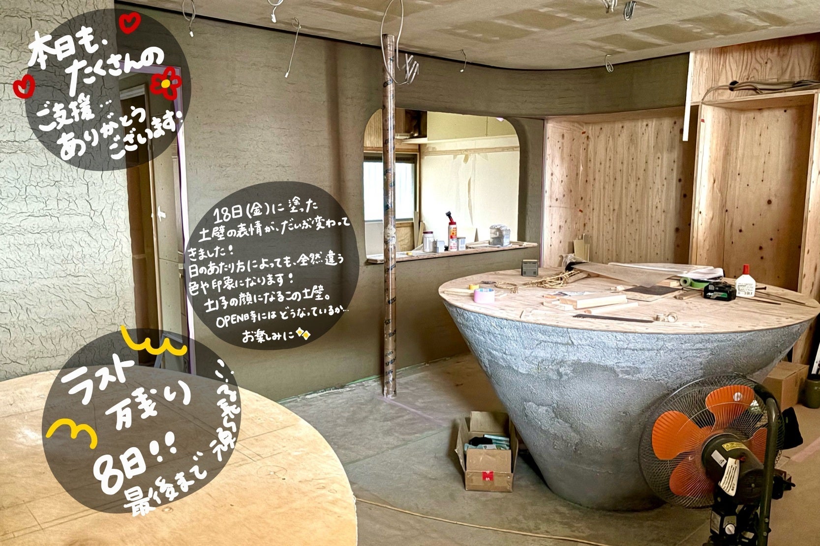 今しかないこの土壁のをしっかりと感じて、「土ノ子の顔になる」この子たちを、見届けたい。OPEN時にはどんな表情になっているのか。お楽しみに!