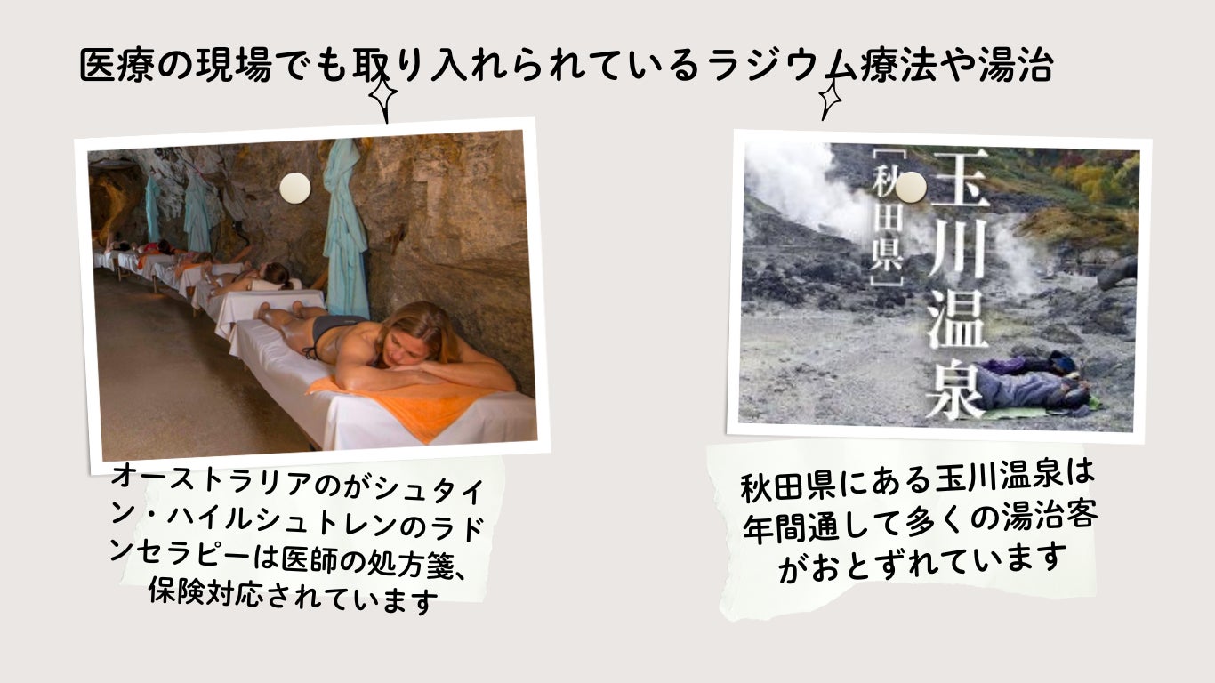 この「ホルミシス効果」を古くから利用しているのが「湯治」の文化。世界的に有名なオーストリア・ガシュタインのラドン療法ヘルスセンターや、日本では秋田県の玉川温泉がラジウム温泉として知られています。