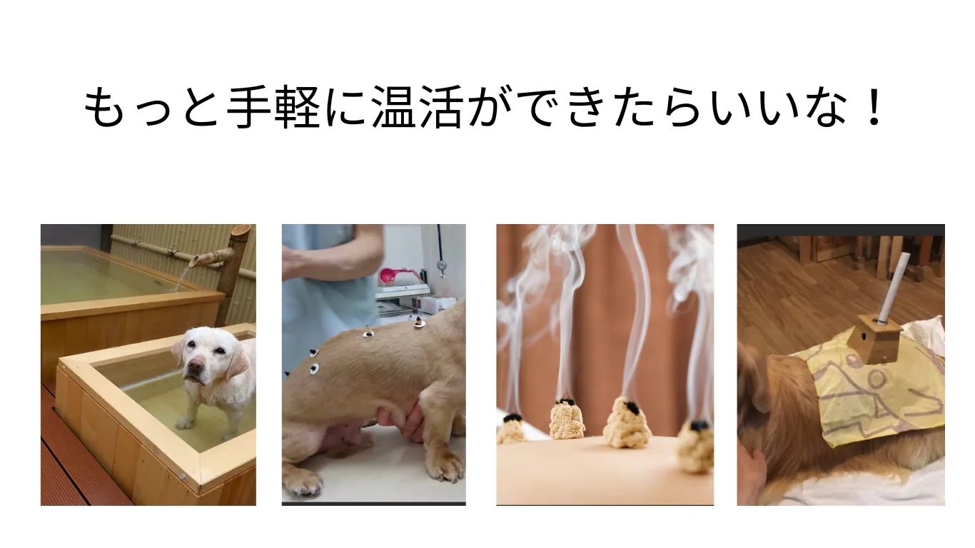 しかし、お灸や温熱マシーン(インディバ)、筋膜リリースガンといった、これまでの温熱療法には課題もありました。たとえば、たとえば、施術中じっとしているのが苦手なネコちゃんは、お灸が難しいケースもあります。また、ワンちゃんも敏感な子は施術自体を嫌がることがあり、飼い主が自宅で簡単にケアできる方法が求められていました。
