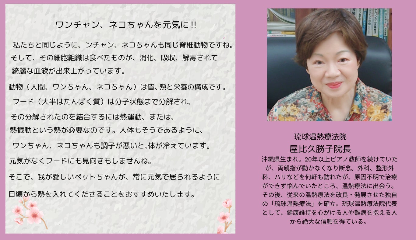 みなさんは「琉球温熱療法」をご存知でしょうか? これは、沖縄の屋比久勝子(やびく かつこ)先生が考案された施術で、ミネラル鉱石ラジウムと遠赤外線、マイナスイオンの力を使い、体の深部まで温めることで血流を促し、健康をサポートするものです。これまで、人に対する「未病医学」として多くの方に取り入れられてきました。