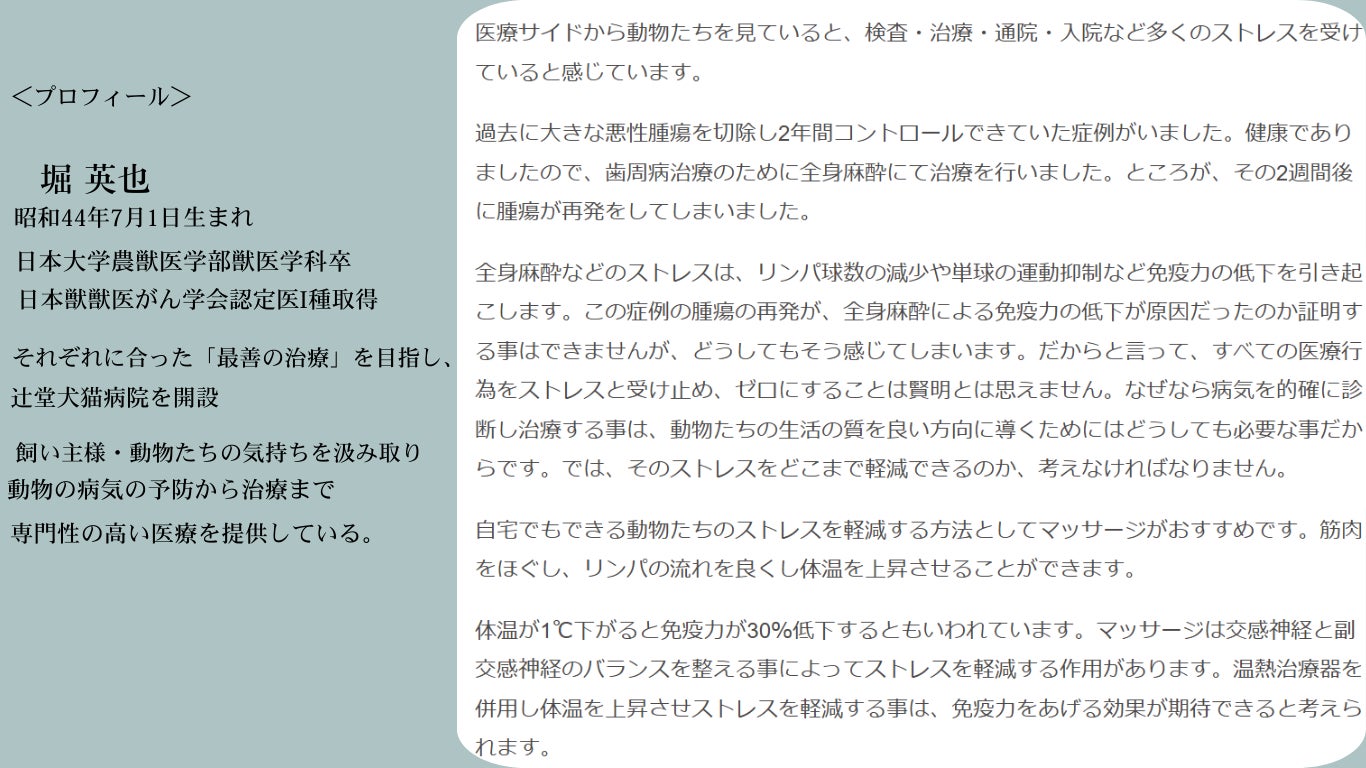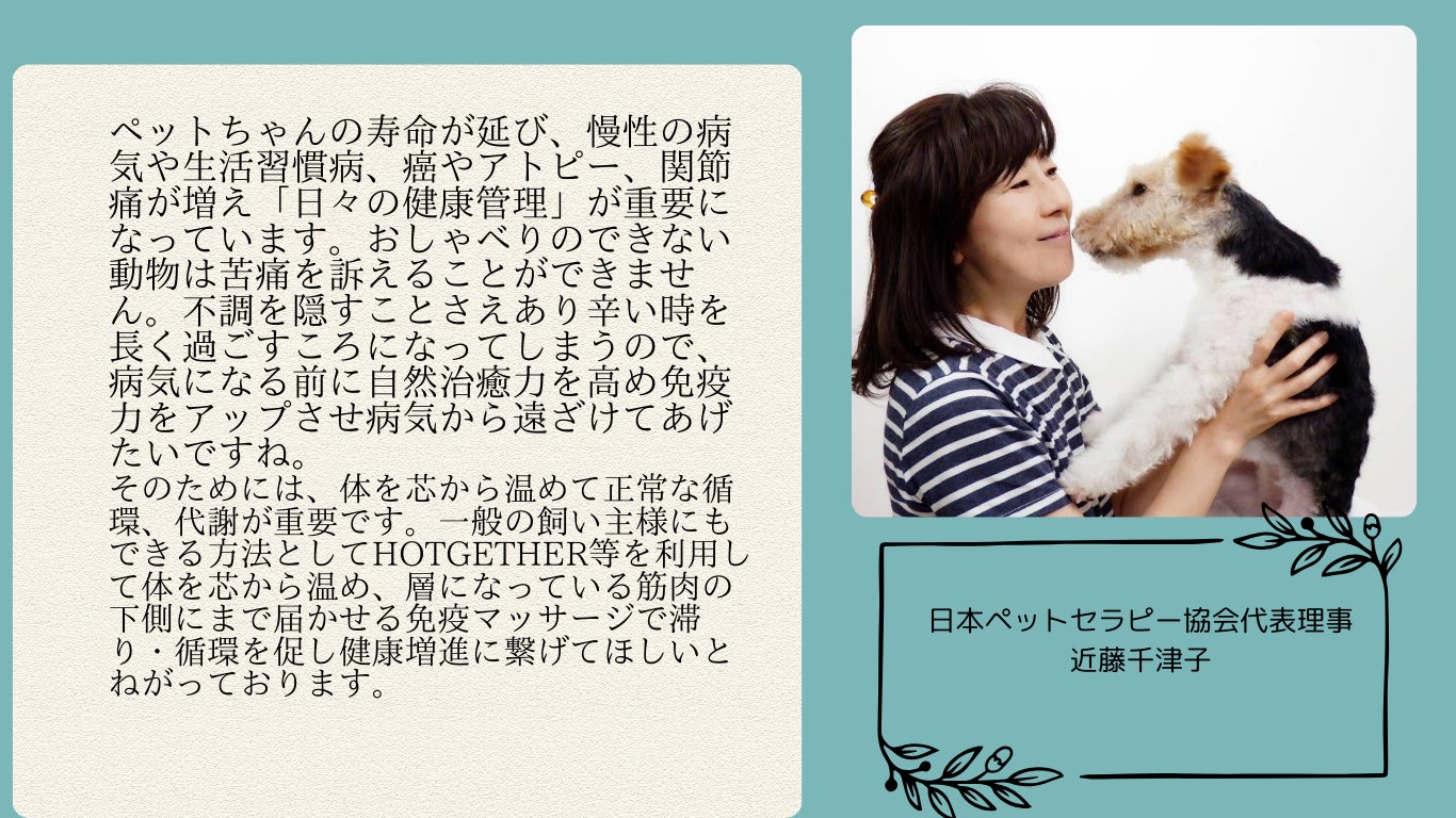 ワンちゃんネコちゃんの血行・リンパの流れを促進する「ドッグマッサージ」が学べるほか、講習を通してワンちゃん・ネコちゃんのカラダを知ることでラジウム温熱器を当てる場所の知識が深まり、より効率的に温熱ケアを行っていただけます。
