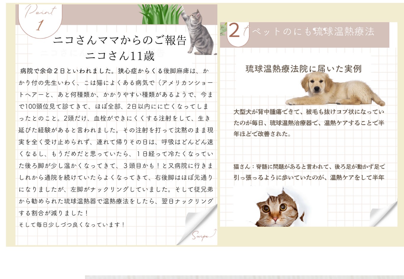 実は、琉球温熱療法を知る直前に私の愛犬2頭をそれぞれ脳腫瘍と心臓疾患で、ほぼ同時期に亡くしました。亡くなる約8ヶ月前から後ろ足も悪くなり歩行が困難になりました。体温も低くなり、弱っていく彼らを見ているのはとても辛かったです。
