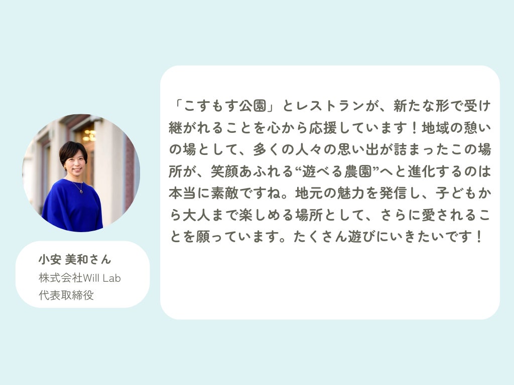「「こすもす公園」とレストランが、新たな形で受け継がれることを心から応援しています!地域の憩いの場として、多くの人々の思い出が詰まったこの場所が、笑顔あふれる“遊べる農園”へと進化するのは本当に素敵ですね。地元の魅力を発信し、子どもから大人まで楽しめる場所として、さらに愛されることを願っています。たくさん遊びにいきたいです!」