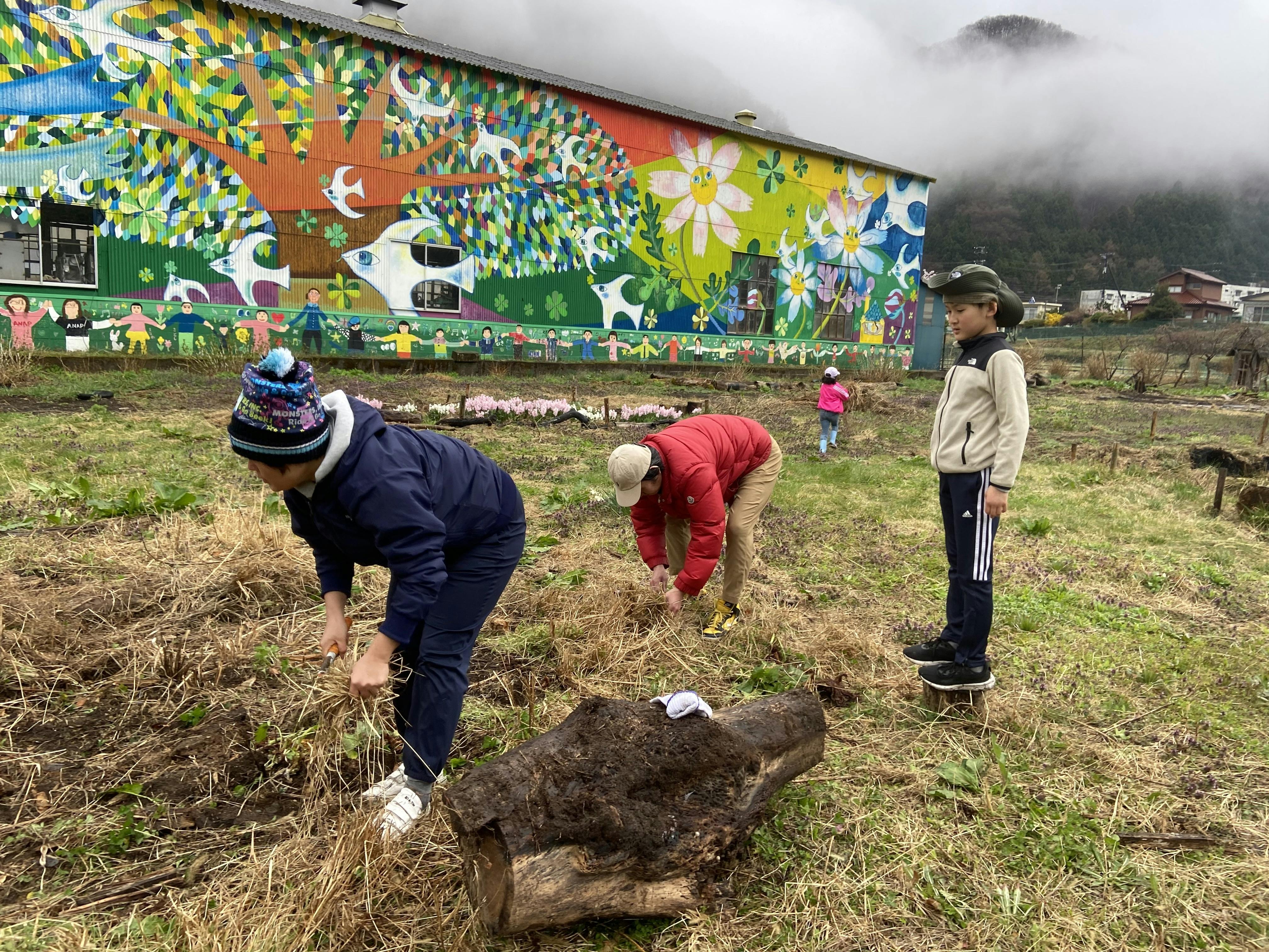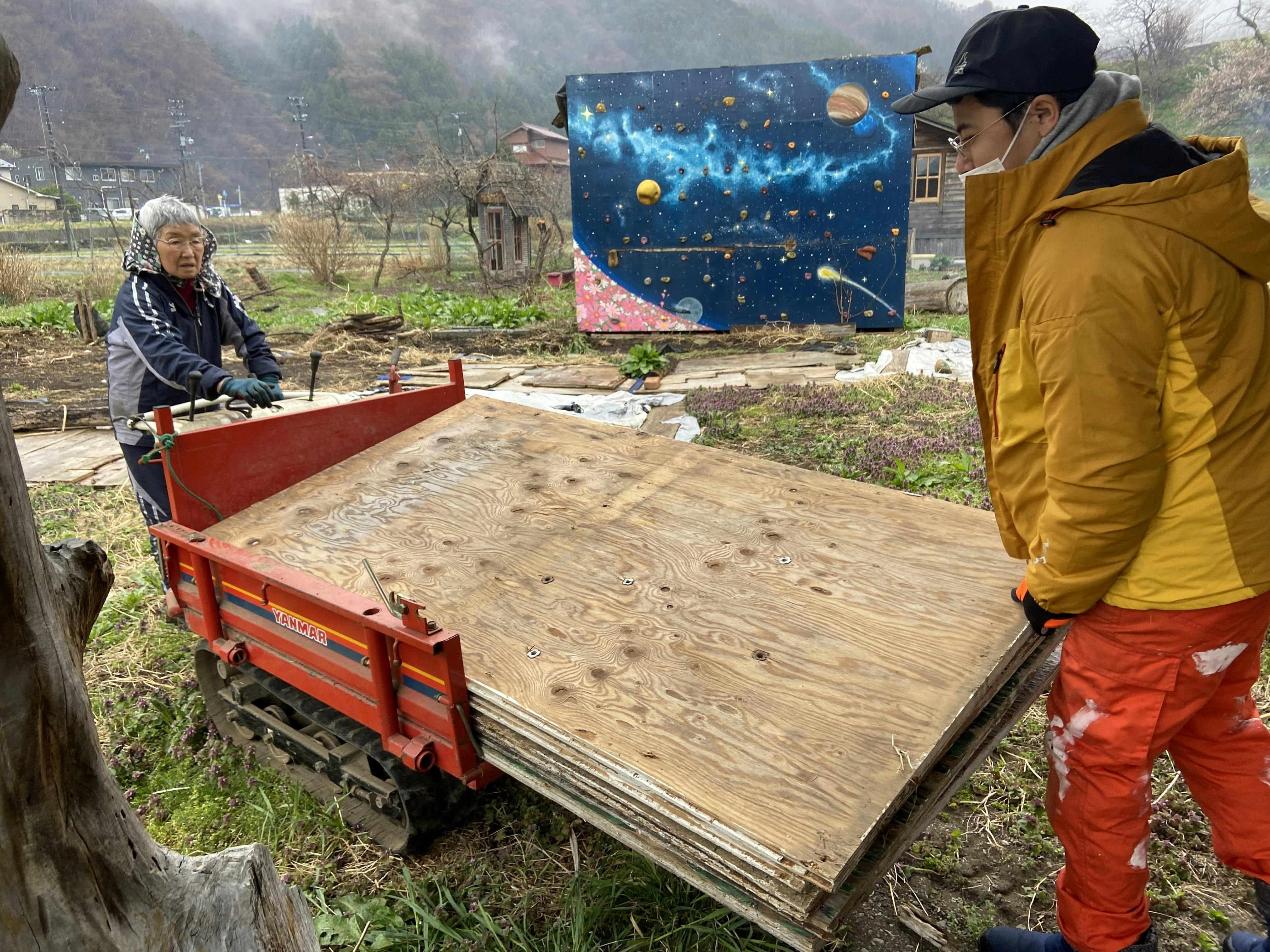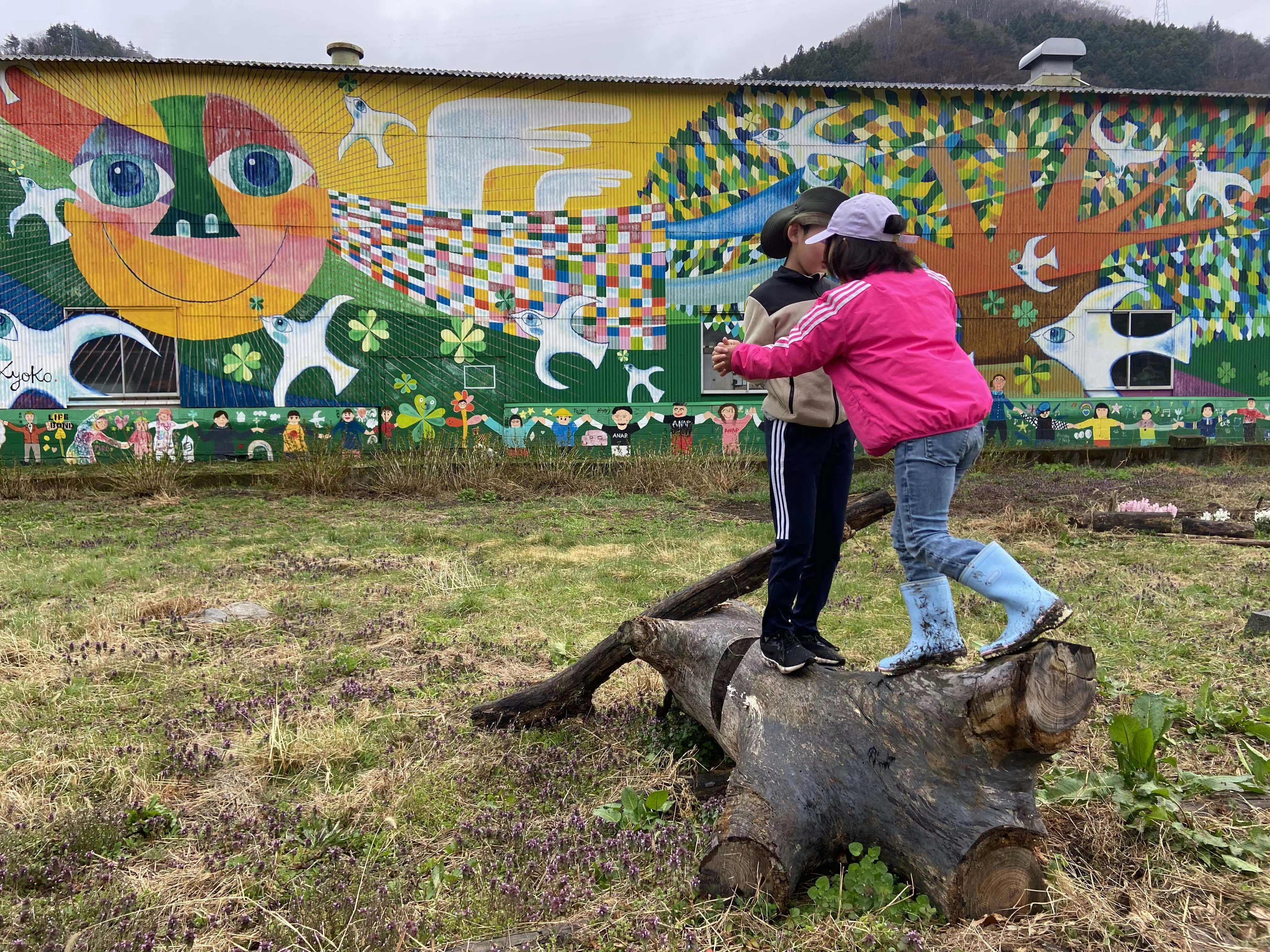 作業のお手伝いにきてくれた子どもたちが上に乗って楽しそうに遊んでいました。