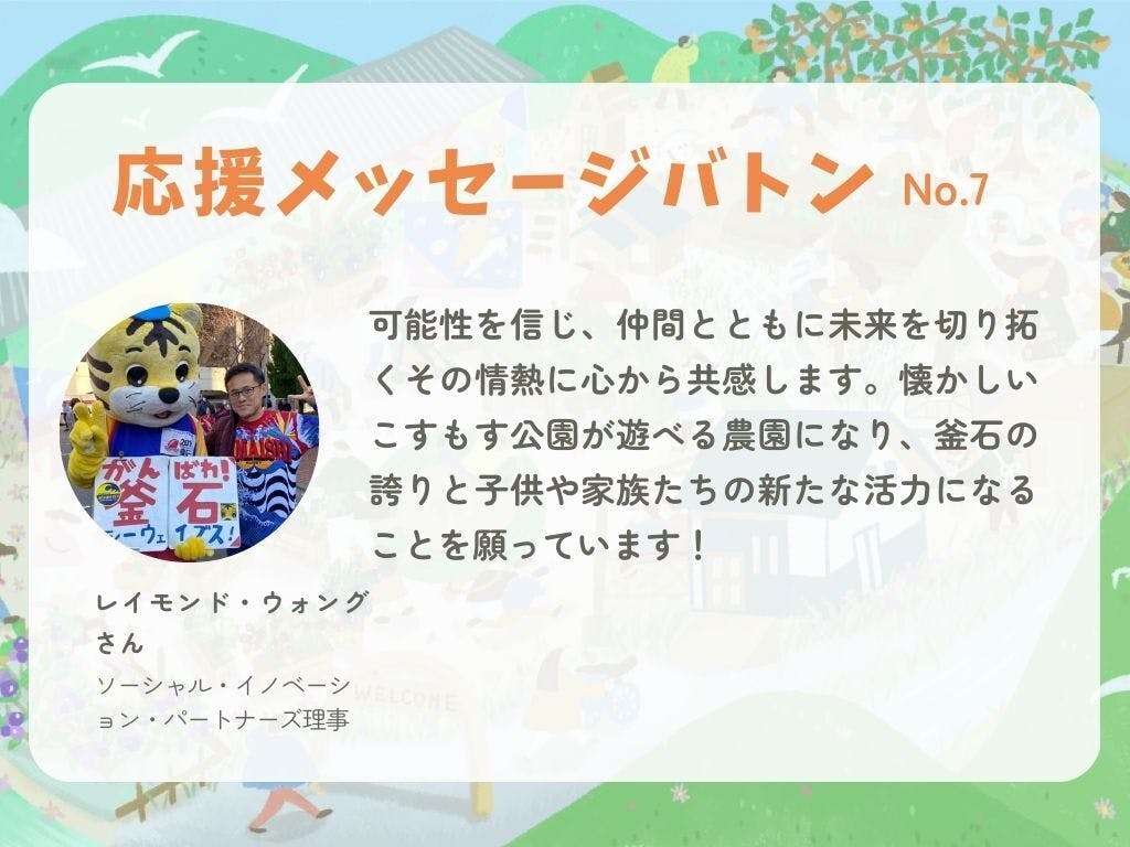 「可能性を信じ、仲間とともに未来を切り拓くその情熱に心から共感します。懐かしいこすもす公園が遊べる農園になり、釜石の誇りと子供や家族たちの新たな活力になることを願っています!」