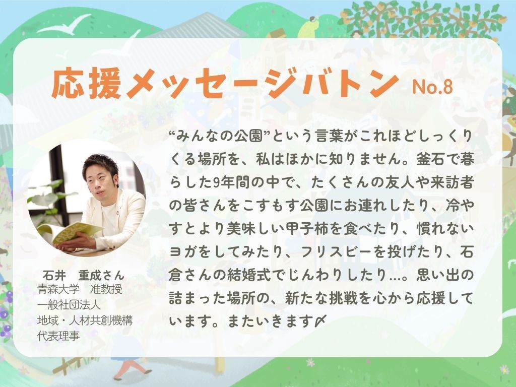 「“みんなの公園”という言葉がこれほどしっくりくる場所を、私はほかに知りません。釜石で暮らした9年間の中で、たくさんの友人や来訪者の皆さんをこすもす公園にお連れしたり、冷やすとより美味しい甲子柿を食べたり、慣れないヨガをしてみたり、フリスビーを投げたり、石倉さんの結婚式でじんわりしたり…。思い出の詰まった場所の、新たな挑戦を心から応援しています。またいきます〆」