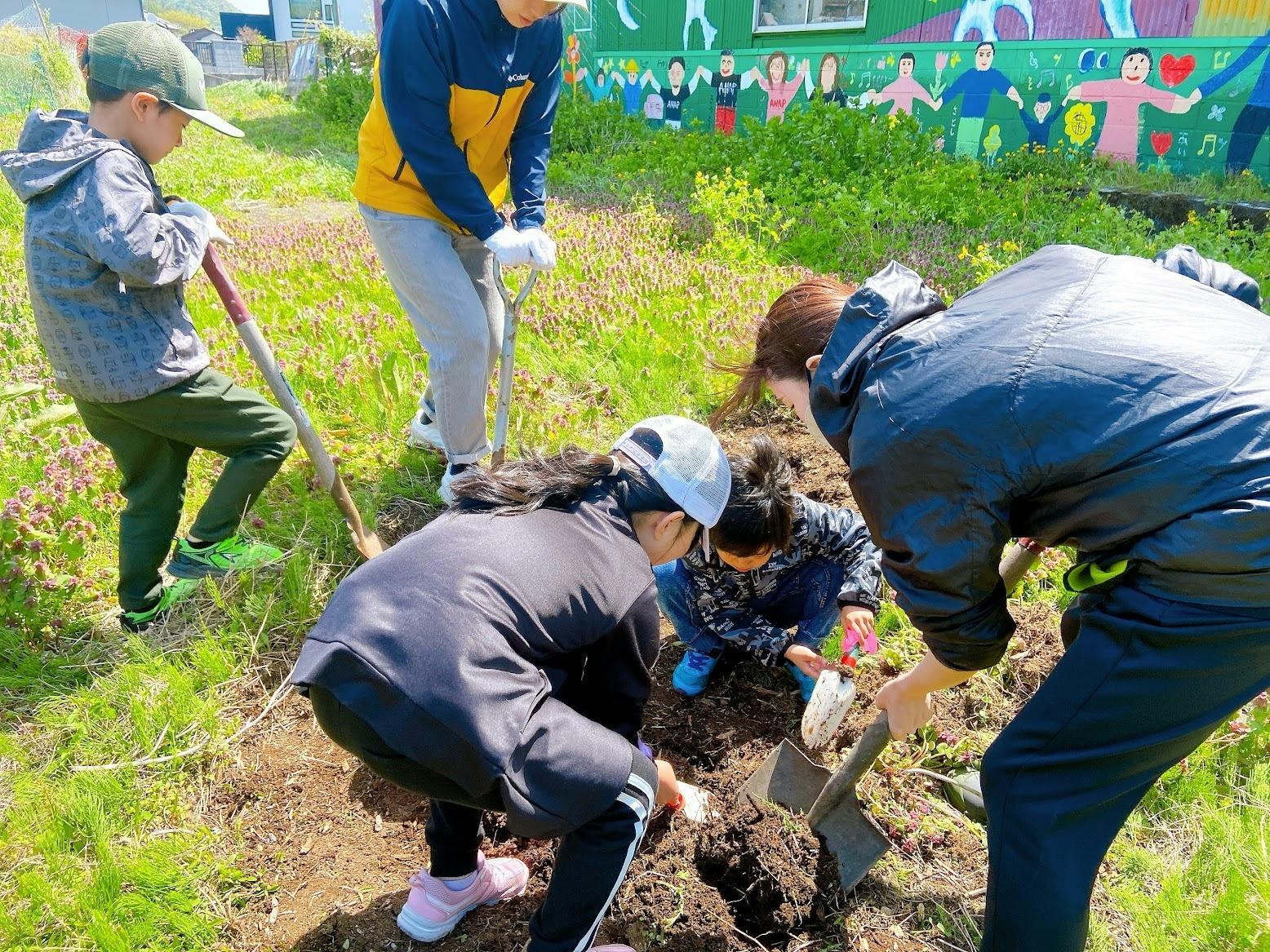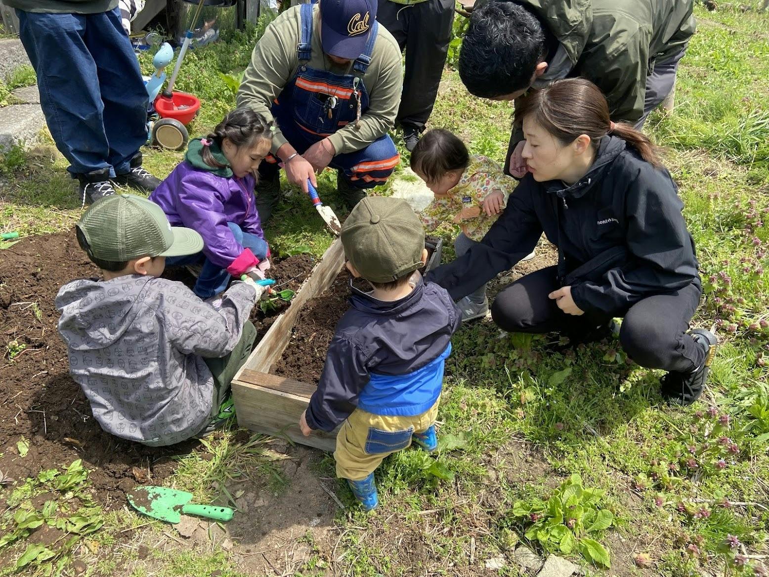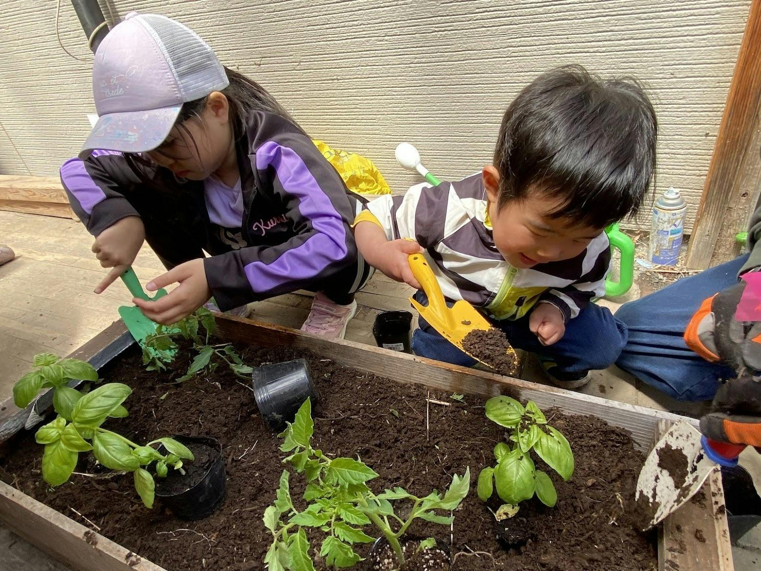 みんなでわいわいしながら土を触って野菜を植えました。育っていくのが楽しみですね。