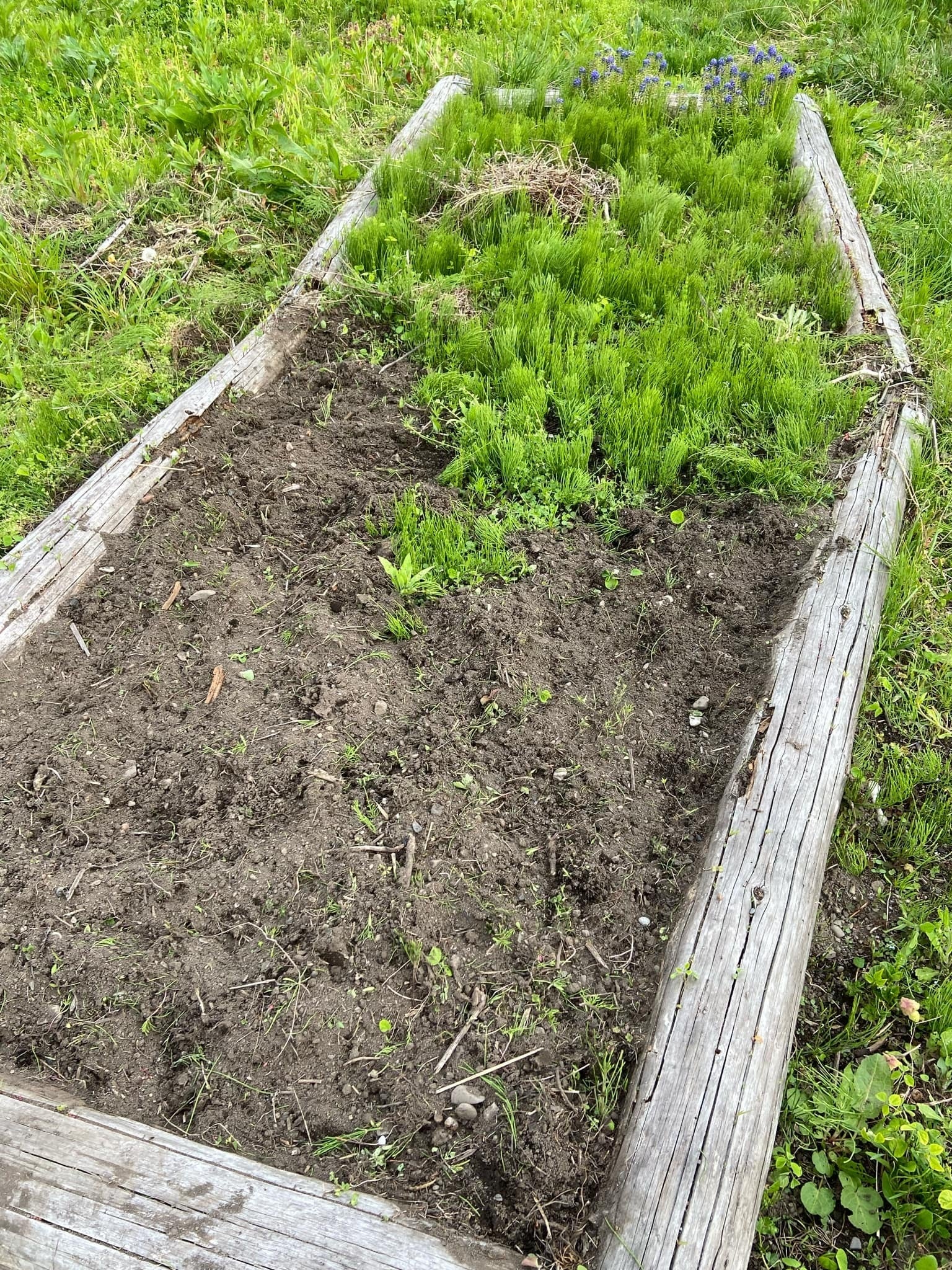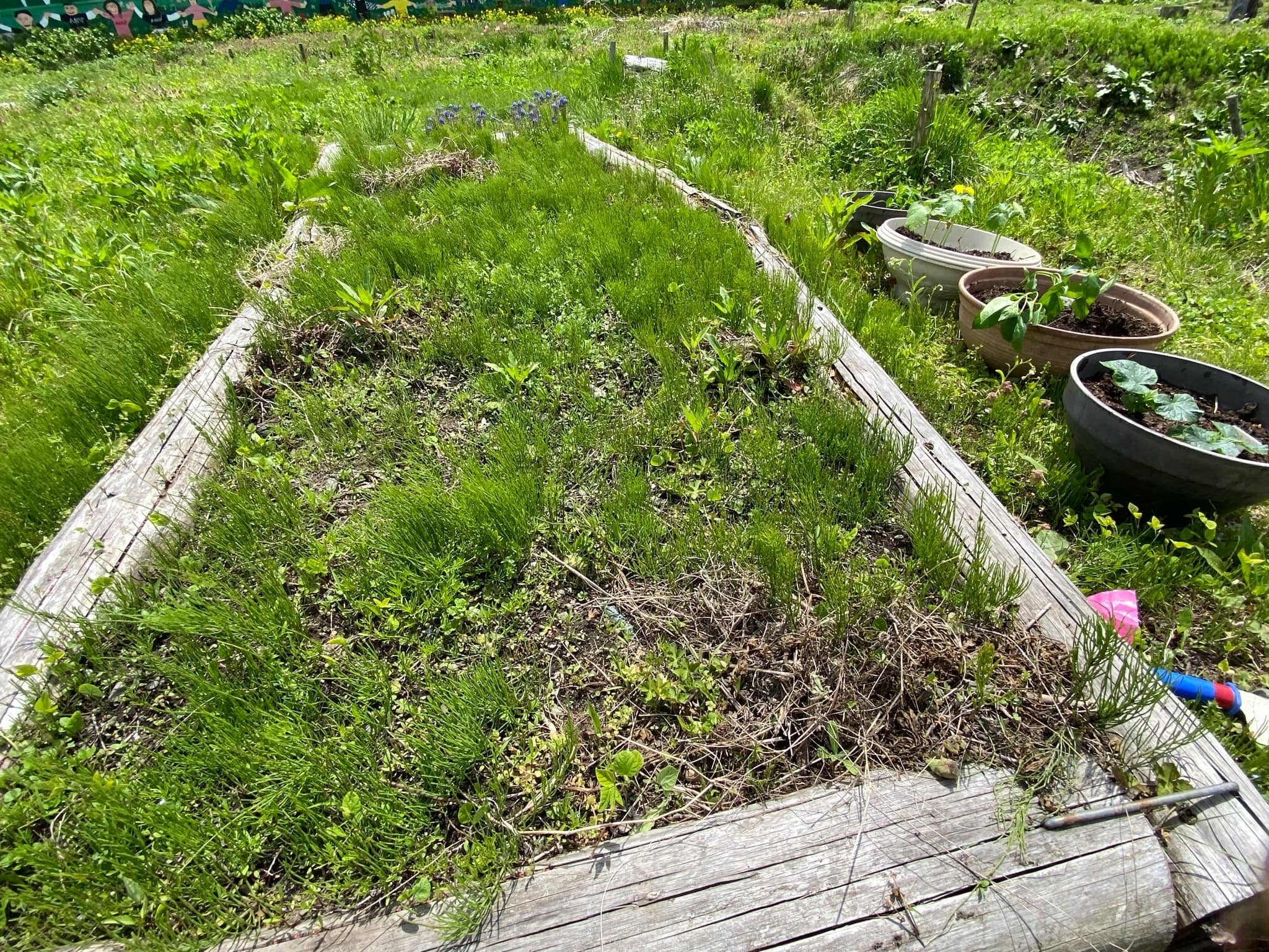こちらはこすもす公園内の杉の木プランター。夏野菜やサツマイモを植える予定のこのプランター、草がかなり伸びてきました。こちらを草取りしながら土を作って苗植えしていきます。
