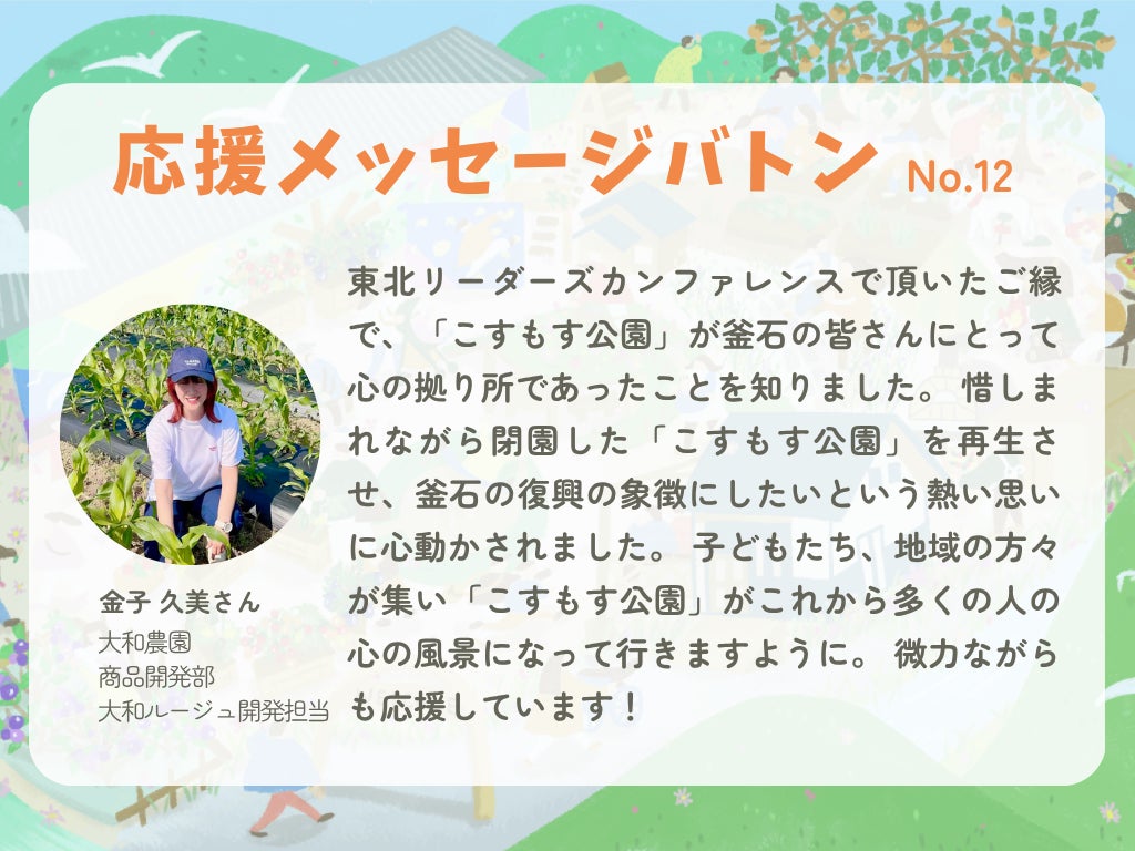「東北リーダーズカンファレンスで頂いたご縁で、「こすもす公園」が釜石の皆さんにとって心の拠り所であったことを知りました。 惜しまれながら閉園した「こすもす公園」を再生させ、釜石の復興の象徴にしたいという熱い思いに心動かされました。 子どもたち、地域の方々が集い「こすもす公園」がこれから多くの人の心の風景になって行きますように。 微力ながらも応援しています! 」