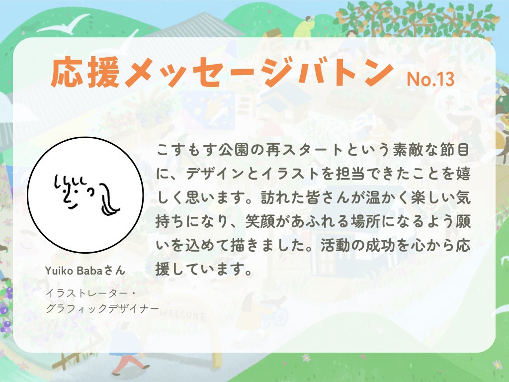 「こすもす公園の再スタートという素敵な節目に、デザインとイラストを担当できたことを嬉しく思います。訪れた皆さんが温かく楽しい気持ちになり、笑顔があふれる場所になるよう願いを込めて描きました。活動の成功を心から応援しています。」