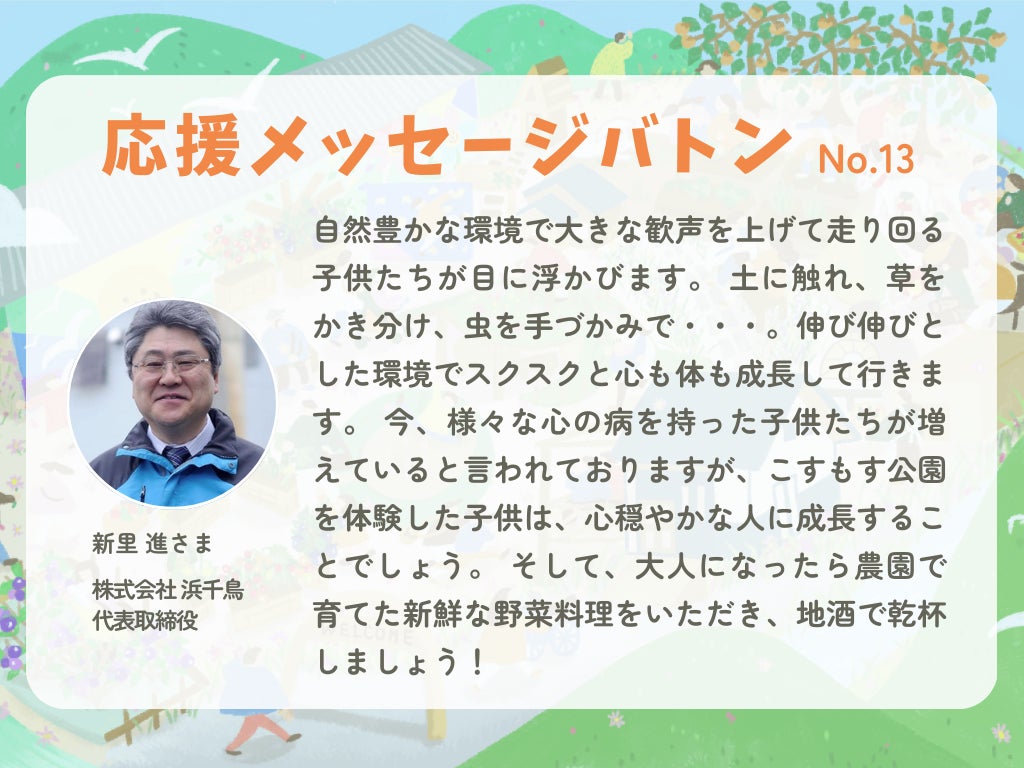 そして浜千鳥の代表取締役である新里社長より、こすもす公園再生プロジェクトへの応援メッセージを頂きました!