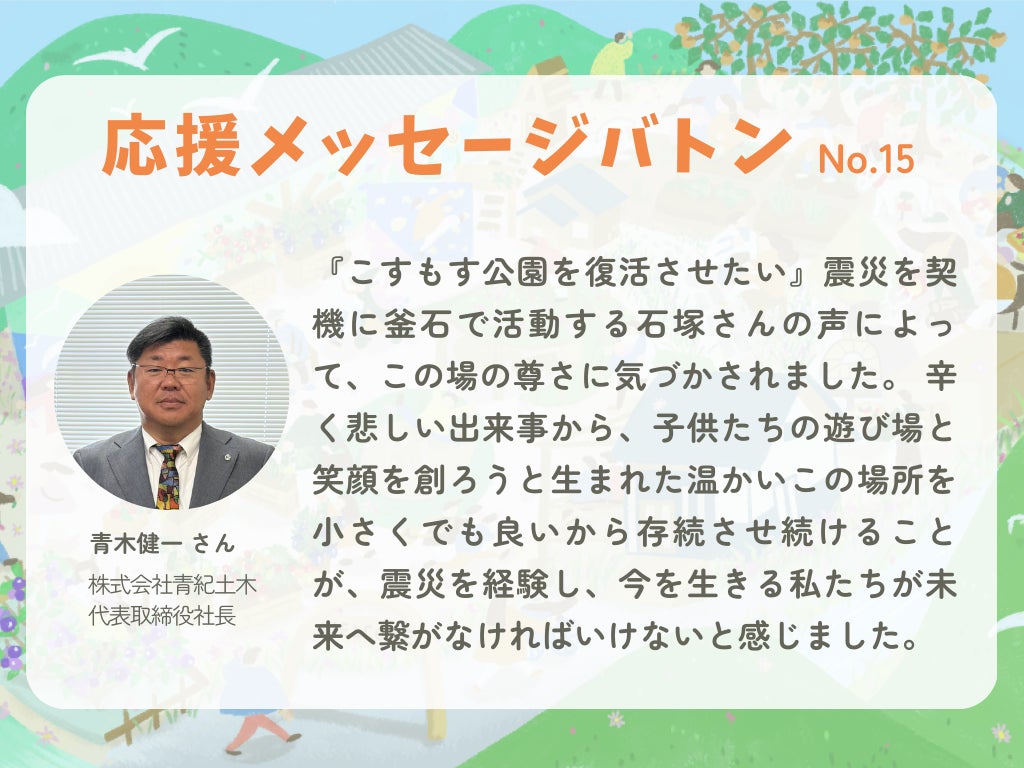 そして、こすもす公園の意義を感じ繋いでいきたいと取り組みに応援いただき、今回スペシャルスポンサーとしてご支援をいただきました!ご協力本当にありがとうございます。