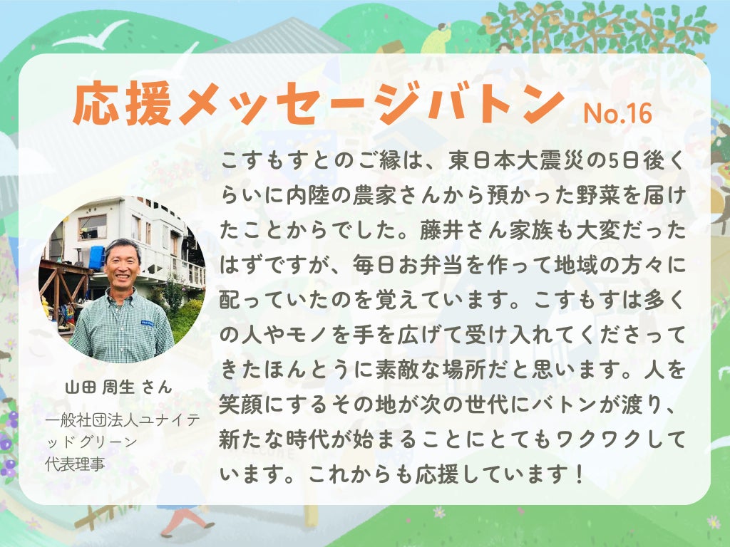 「こすもすとのご縁は、東日本大震災の5日後くらいに内陸の農家さんから預かった野菜を届けたことからでした。藤井さん家族も大変だったはずですが、毎日お弁当を作って地域の方々に配っていたのを覚えています。こすもすは多くの人やモノを手を広げて受け入れてくださってきたほんとうに素敵な場所だと思います。人を笑顔にするその地が次の世代にバトンが渡り、新たな時代が始まることにとてもワクワクしています。これからも応援しています!」