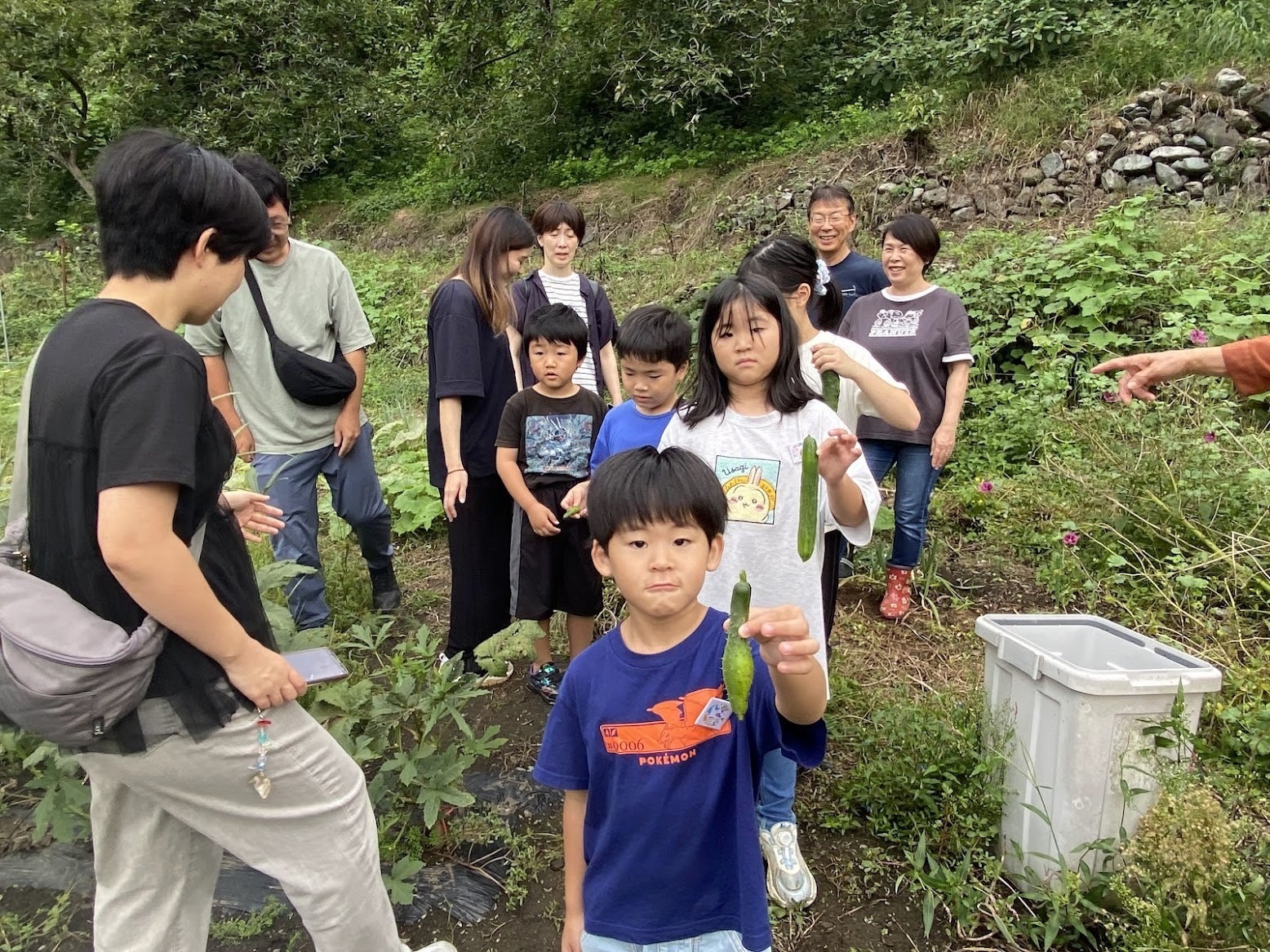 まずはこすもすファーム内にある、オーナーの藤井さんご夫婦が育てている農園に行き、お野菜の説明やプチ収穫体験をしました。