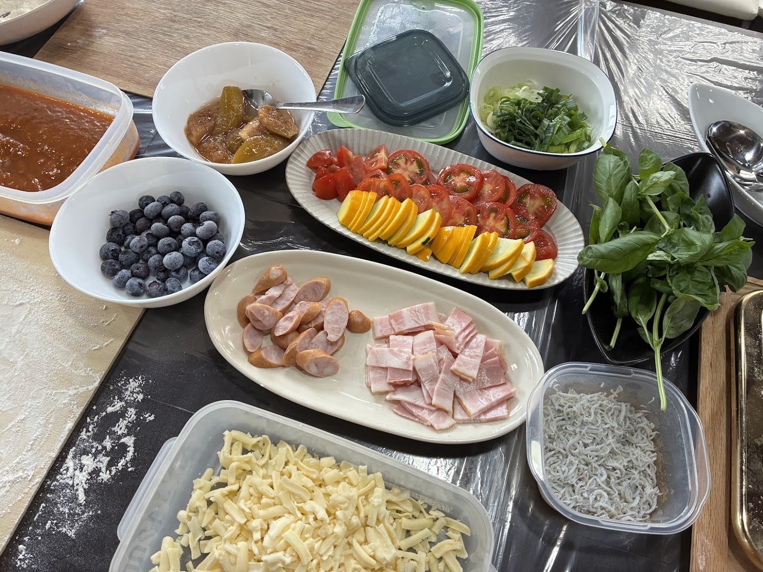 そしてお待ちかねのピザづくり!お野菜はこすもす農園やそのご近所の農家さんが育てたフレッシュバジルやすずこまトマト、ズッキーニ、スイーツピザ用に手作りイチヂクジャムやブルーベリーなど地産地消のものばかりです。