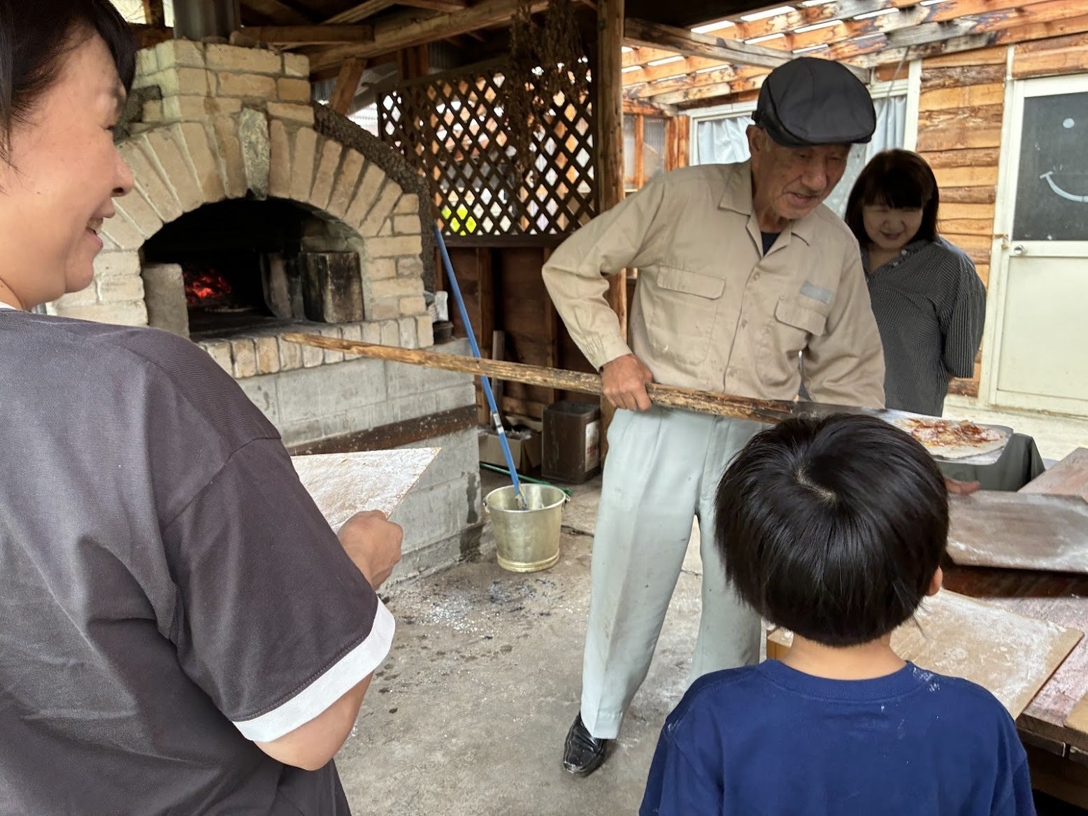 園内にある手作りの大きなピザ窯。朝から火を入れて400度まで上げてから数分でカリッと焼きます。子どもたちも焼く様子に釘付け。