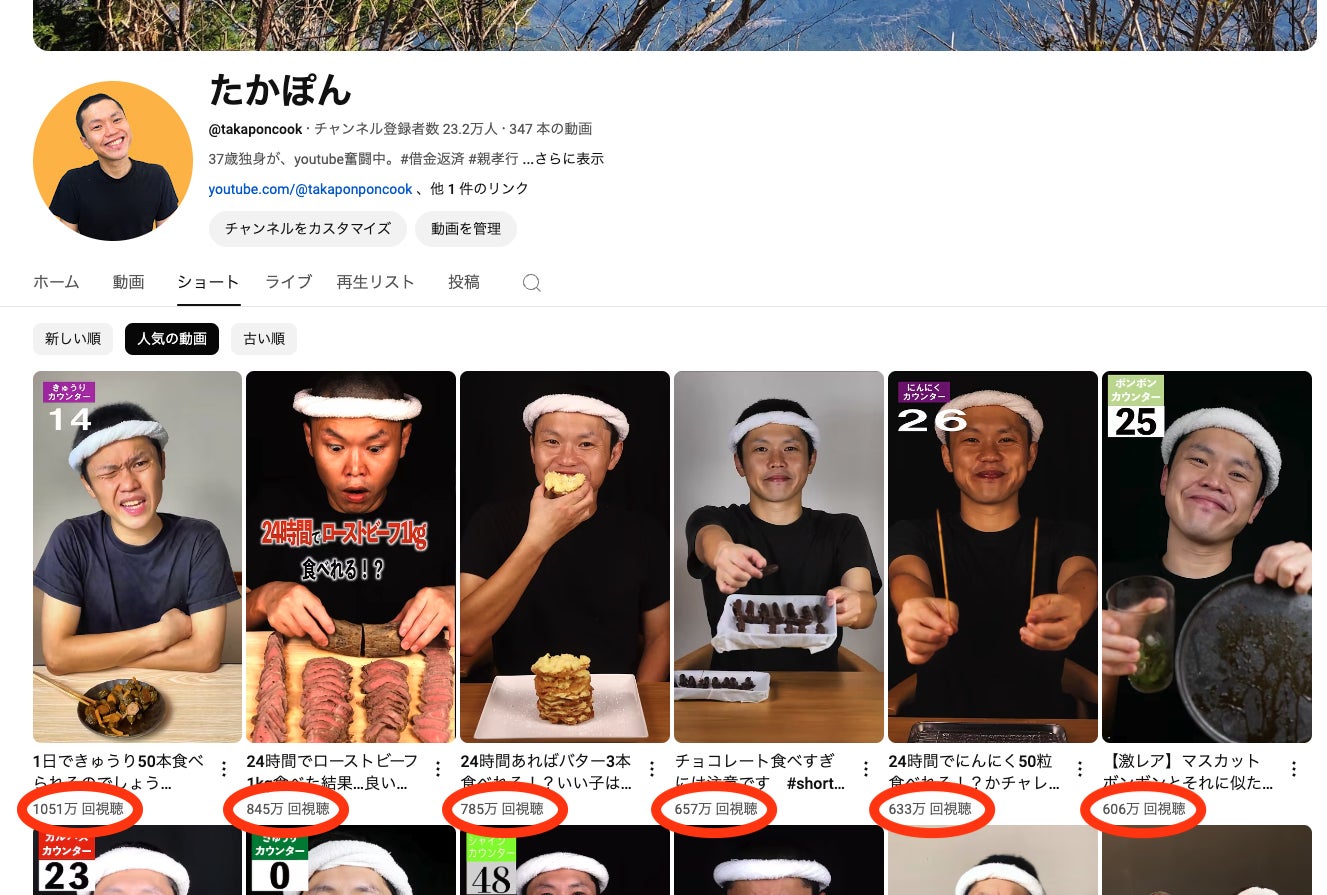 これまでに100万回以上再生されたショート動画は100本以上あり、