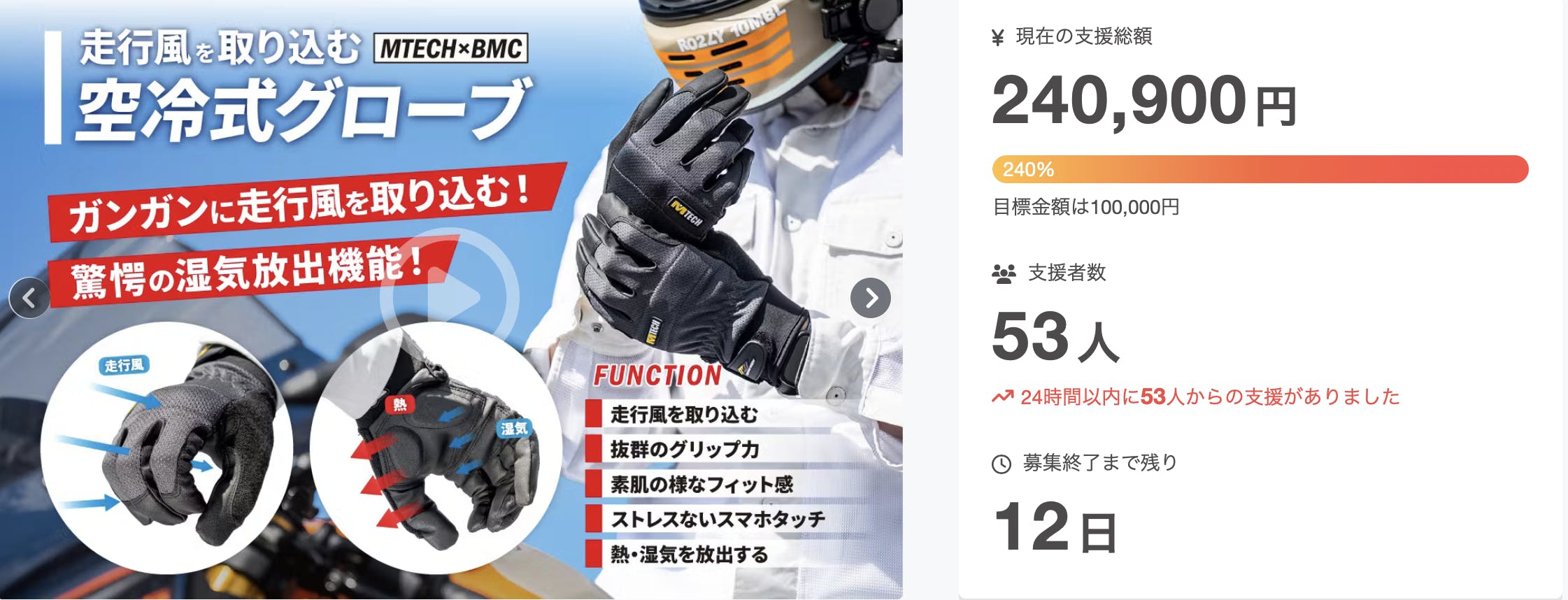 本日12:00開始しました空冷式グローブ!(プロジェクトページ)https://camp-fire.jp/projects/828314/view?utm_campaign=cp_po_share_c_msg_mypage_projects_show開始3時間で目標金額240%突破しました!早期のご支援、誠にありがとうございます!数量限定ですので、ご興味ある方はお早めにご支援ご検討お願い致します。BLITZ WORKSローリー青野