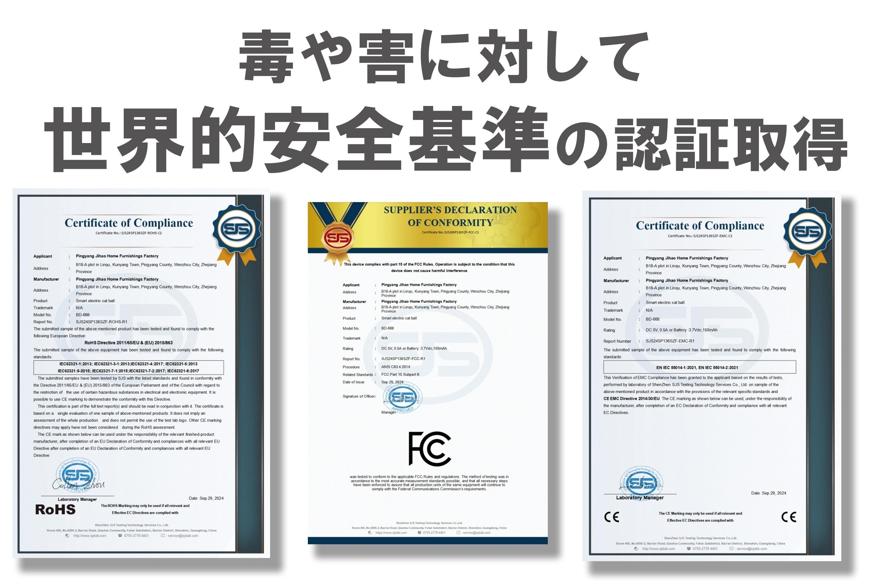 口に入れる物なので安全性に配慮しました。日本のJ-Mossグリーンマークより厳しいRoHS認証など、3種の認証を取得し国際的な基準を満たしており、素材の毒や害に対しての安全基準を証明しております。