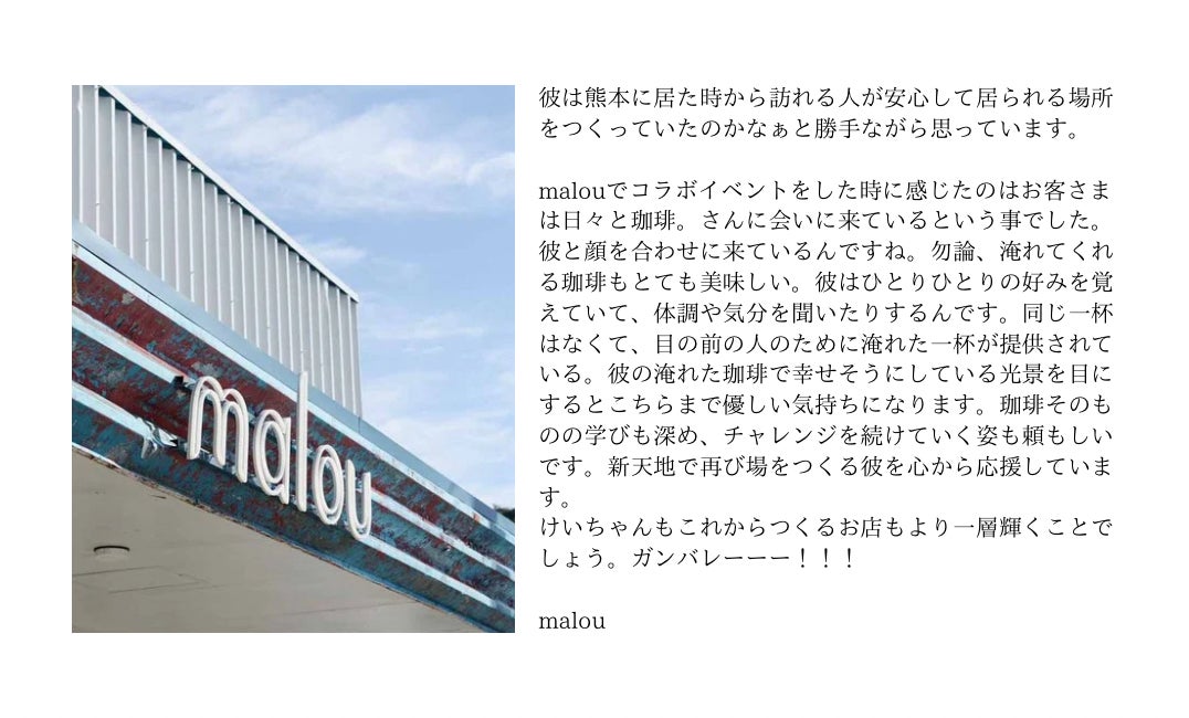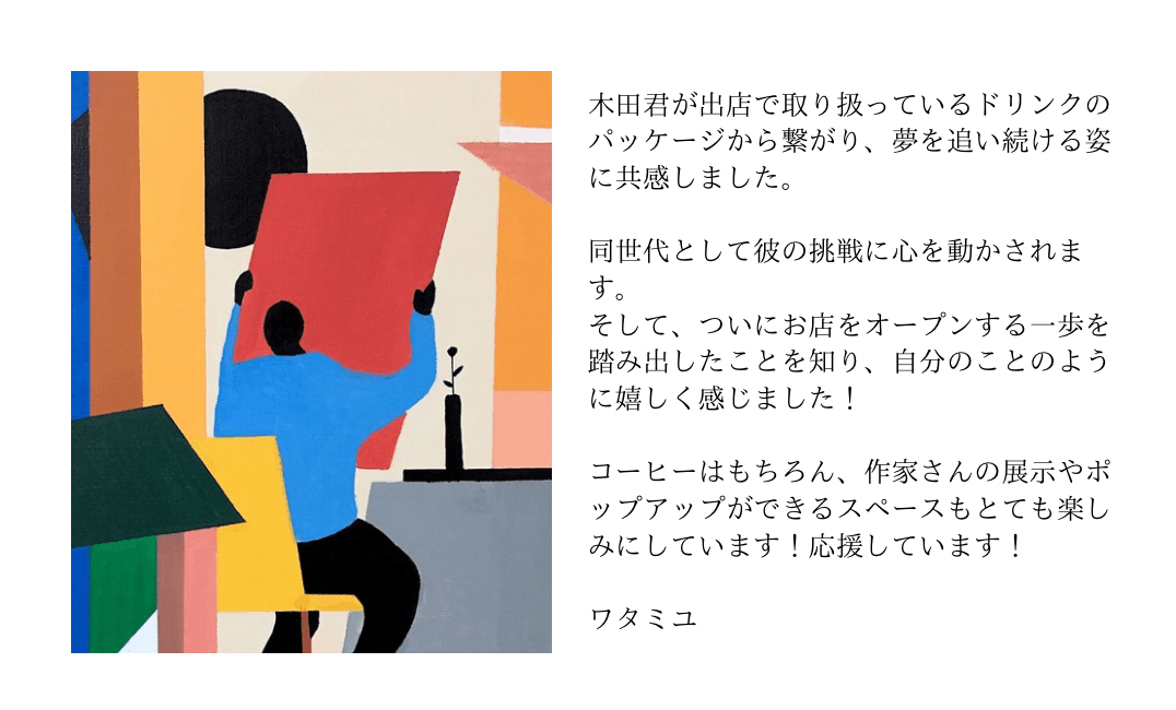 この熱量や表現力を都内だけに留めるのではなく全国、特に地元に還元できるには色んな経験を積まなければなりません。それで、このお店では色んな人が自分を表現して全国の方に知ってもらい、それから地元に帰って新しいチャレンジや大きなイノベーションを起こせるようにキッカケとなるお店にしたいです。それで今回、僕が提供している珈琲だけに止まらずワインを始めとするお酒やアートを融合させたお店を立ち上げ、このプロジェクトを中心に同世代のアツい志を持った若い人たちと一緒に都内だけではなく、地方に飛び出して羽ばたけるようなお店を営みたいと考えこのプロジェクトを立ち上げました。