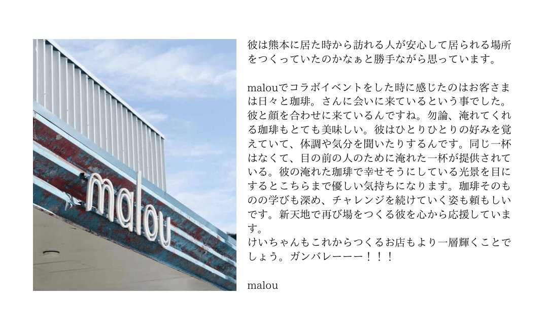 日々に区切り「。」をつける空間。珈琲を作るのも味わうのも人です。珈琲と同じように人に重きを置いています。それがこれからの日本の珈琲史になくてはならないものだと考えているからです。このブランドに関わる全ての人の暮らしが穏やかになるように励んでいます。