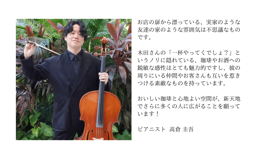 このショップでは、スペシャルティコーヒーとワインをお手軽な価格で提供し、こだわりを持って作られた美味しい食文化にみんなで触れて自分の感覚や経験を養えるような場所にします。