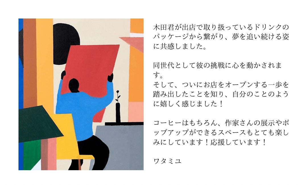 この熱量や表現力を都内だけに留めるのではなく全国、特に地元に還元できるには色んな経験を積まなければなりません。それで、このお店では色んな人が自分を表現して全国の方に知ってもらい、それから地元に帰って新しいチャレンジや大きなイノベーションを起こせるようにキッカケとなるお店にしたいです。それで今回、僕が提供している珈琲だけに止まらずワインを始めとするお酒やアートを融合させたお店を立ち上げ、このプロジェクトを中心に同世代のアツい志を持った若い人たちと一緒に都内だけではなく、地方に飛び出して羽ばたけるようなお店を営みたいと考えこのプロジェクトを立ち上げました。
