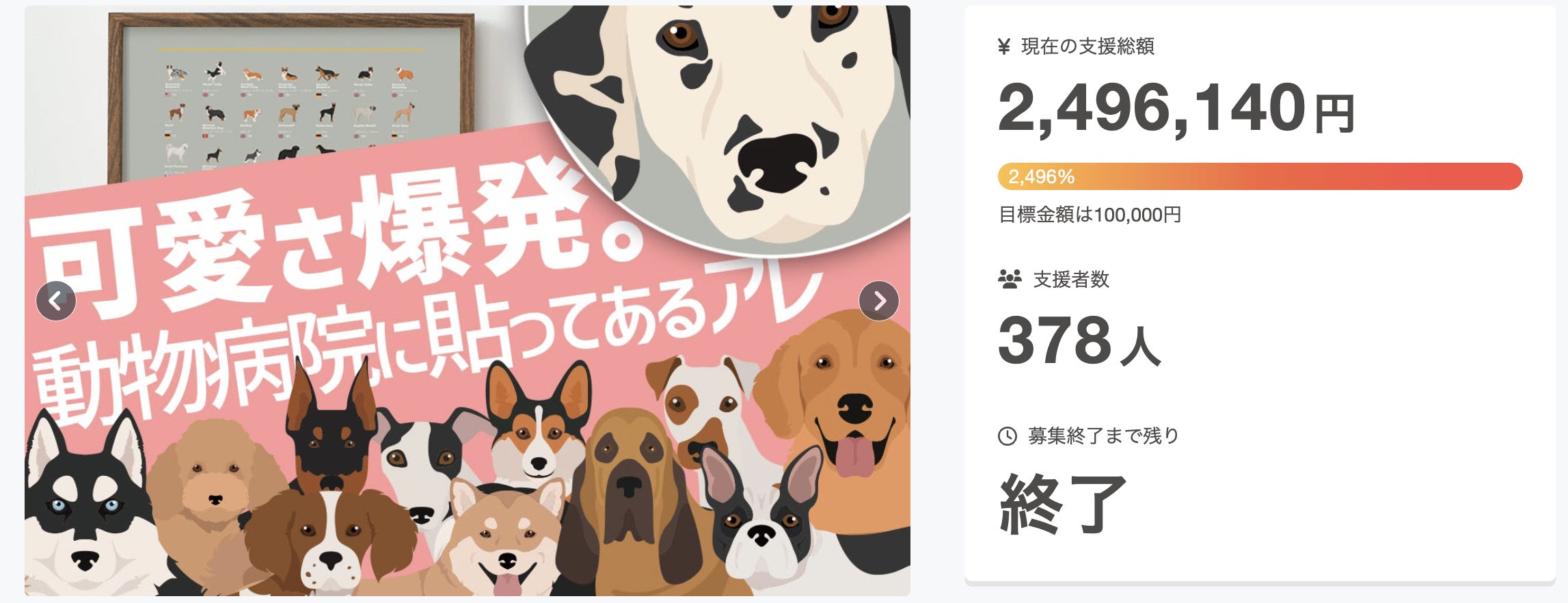 2025/02/18 13:47みなさま、こんにちは!「猫、ねこ、ネコ!インテリアのためのデザイン【動物病院の猫ポスター】」プロジェクトチーム富田と申します。はじめましてのご挨拶とともに、開始早々リターン完売のお礼も申し上げることとなりました。まずは心からのお礼まで。シリーズで気に入っていただき、発売開始を待っていていただいた方も多く、早々に沢山の応援、本当にありがとうございます!そして、以下の追加リターンが急遽決定しました!・『追加リターン』額なし・単品 42%OFF¥3,450(税込) (追加25名分、6月末お届け予定)・『追加リターン』額なし・単品 40%OFF¥3,570(税込) (追加25名分、6月末お届け予定)・『追加リターン』額なし・2枚組 50%OFF¥5,950(税込) (追加10名分、6月末お届け予定)* 追加分の「割引率」は既存のリターンと同じですが、「お届け日程」が2ヶ月ほど遅くなります* 既にご支援をいただき、追加リターンに変更をご希望の場合はメッセージ機能からお気軽にご連絡ください。(お手数になってしまいますが、既にご支援されたリターンのキャンセルを行い、新たにご希望のリターンにご支援いただきます。)CAMPFIREキャンセルについてhttps://help.camp-fire.jp/hc/ja/articles/230472307それでは引き続き宜しくお願いします!プロジェクトはこちら。猫、ねこ、ネコ!インテリアのためのデザイン【動物病院の猫ポスター】https://camp-fire.jp/projects/828397/ もっと見る