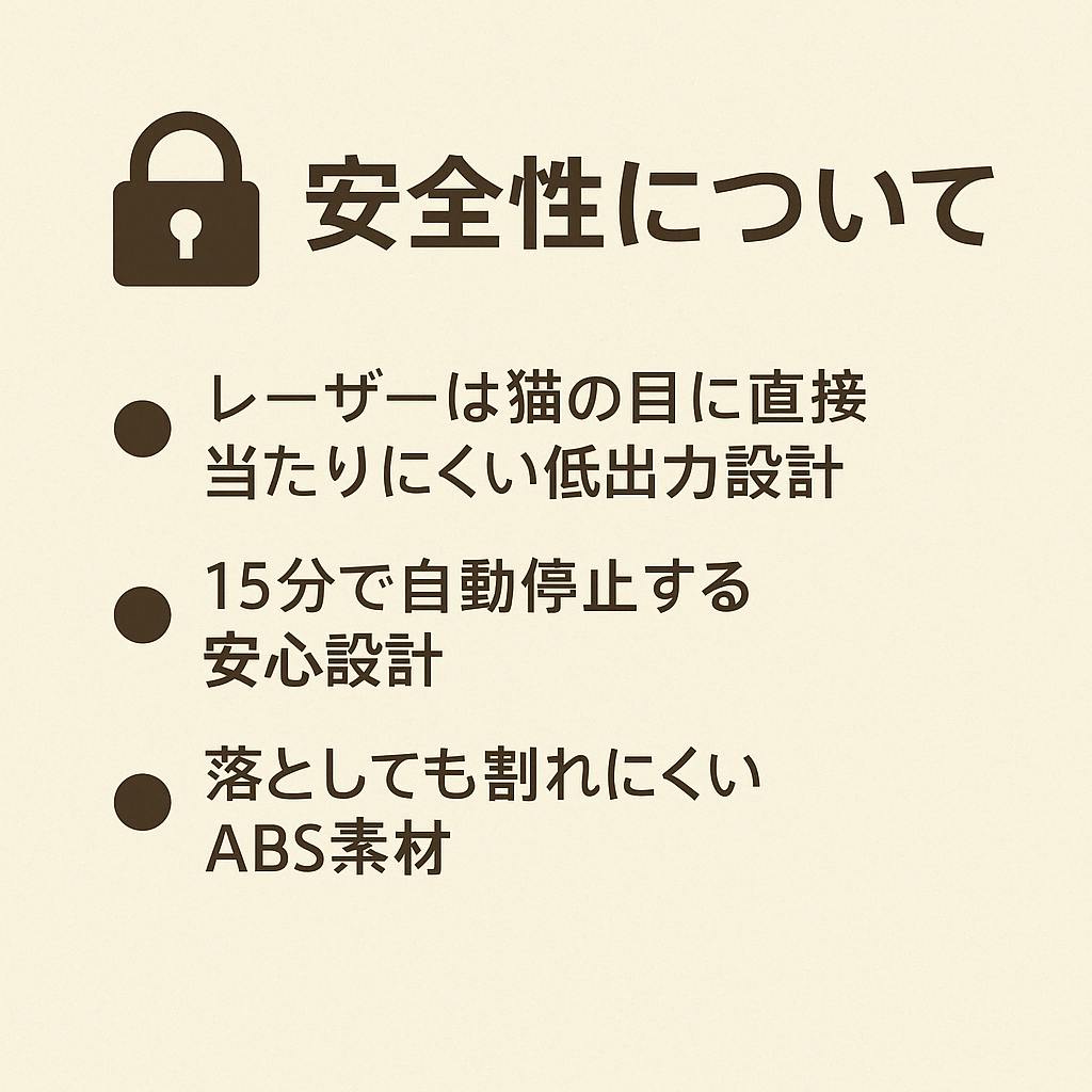 A. キャットライトは低出力レーザーを使用しており、猫の目に直接当たりにくいよう角度設計されています。さらに15分で自動停止する安心設計です。また、猫はレーザーの照射先(動く光)を追いかける習性があるため、光の発信元を直接見ることはほとんどありません。