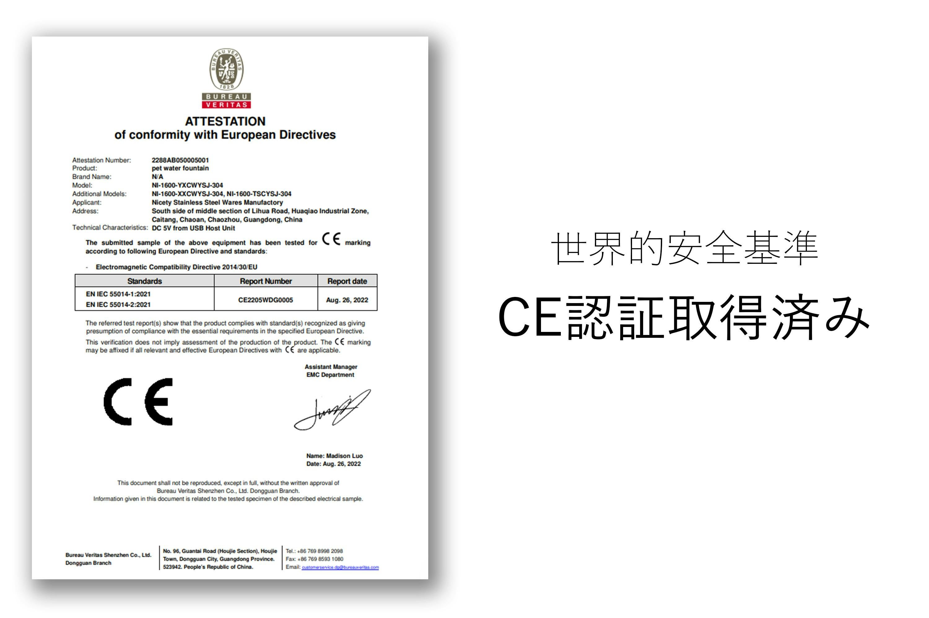 安心してお使いいただくために、世界的な安全基準であるCE認証を取得しています。