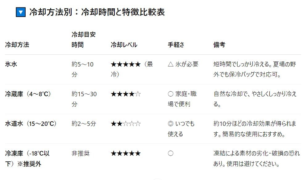 氷水で約5〜10分、冷蔵庫で15〜30分が目安となります。水道水でも冷やせますが、夏場は冷却効果が弱まることがあります。