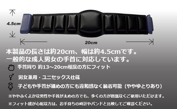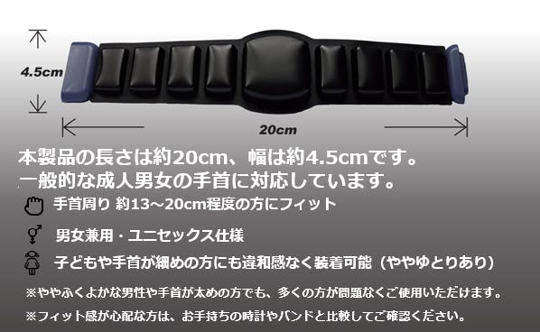 A. バンド長さは一律で約20cmとなっております。一般的な体格の方から、ややふくよかな成人男性まで、問題なくご使用いただけるサイズ感です。