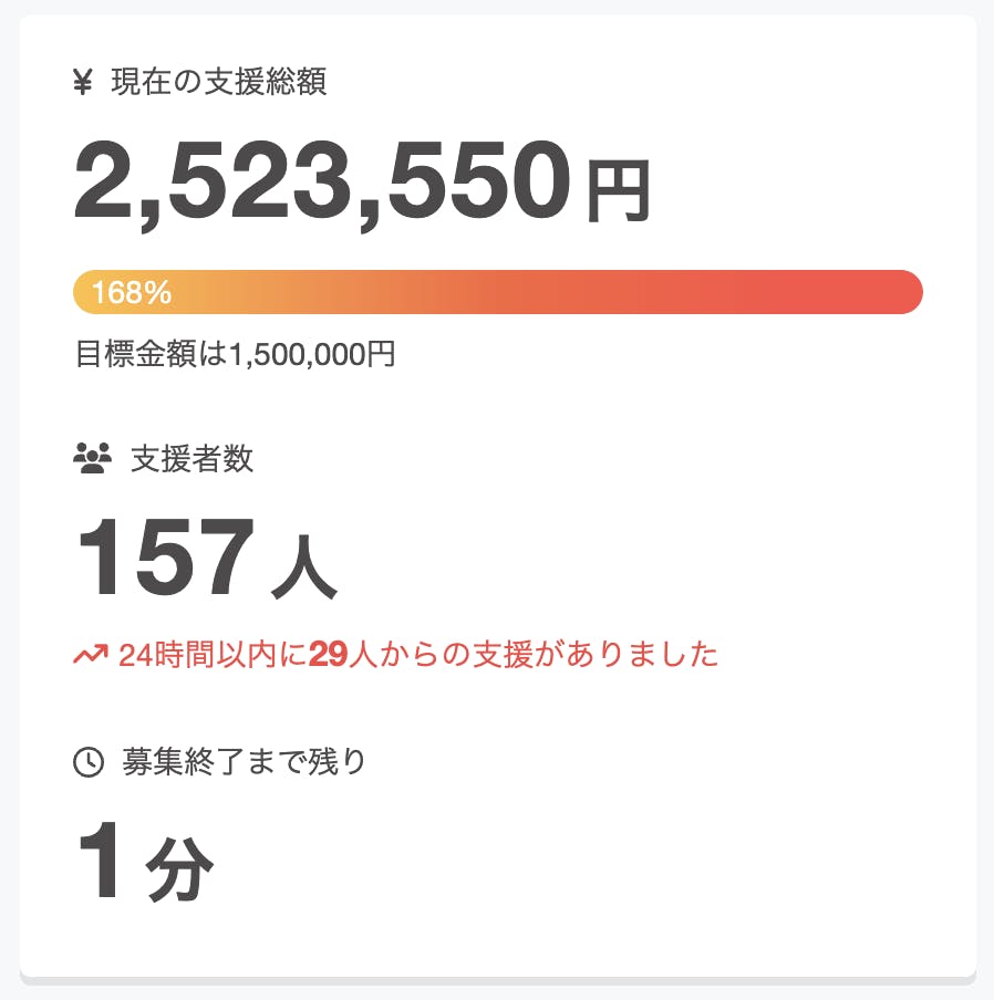 無事に昨日、終了となり、目標を大きく上回るご支援をしていただくことができました。