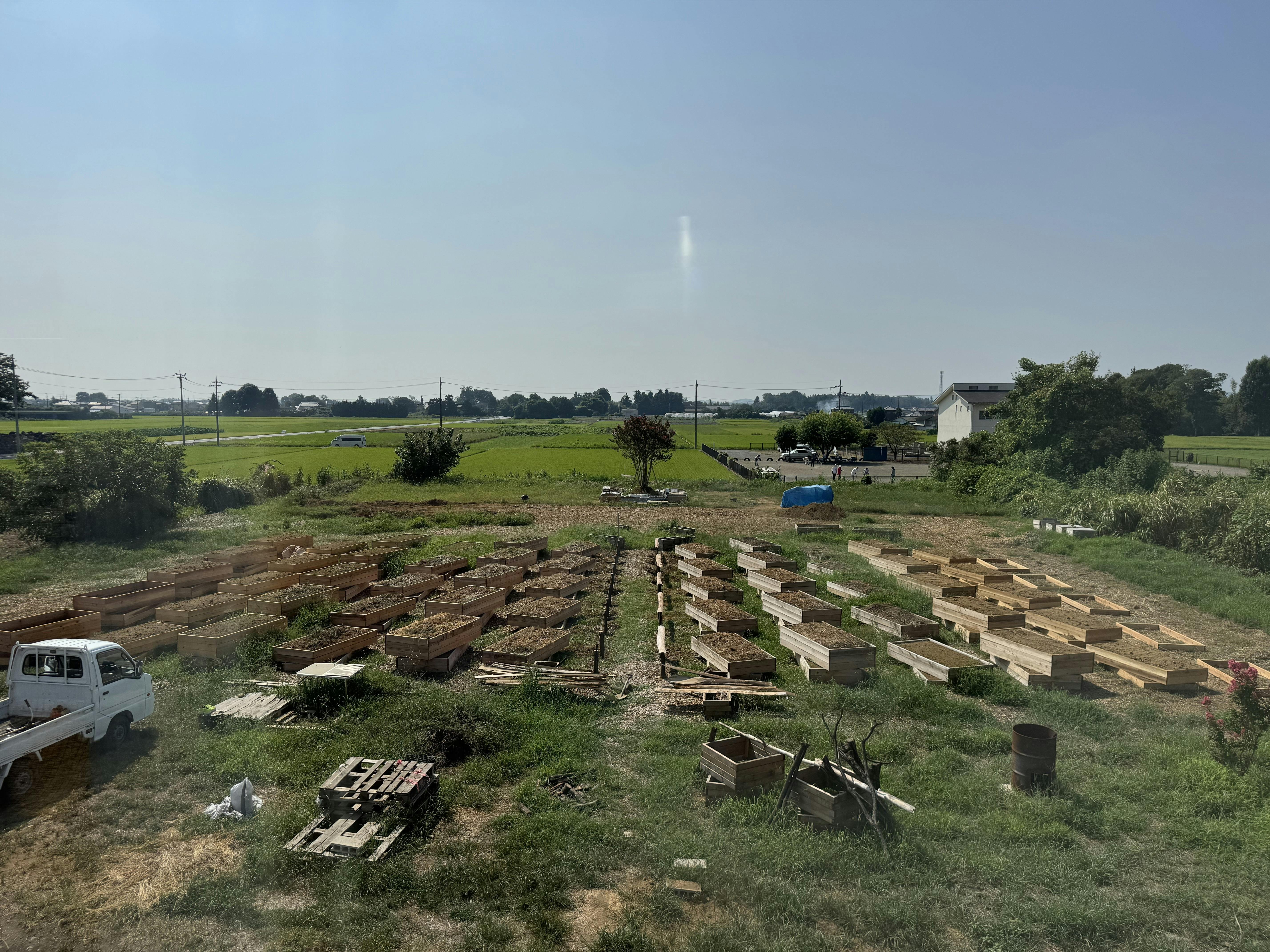 本日午前は、レイズドベッドの追加、メインストリートの左右にかかる柵の造作、全体の草刈りをして、レイズドベッドの草マルチを追加。