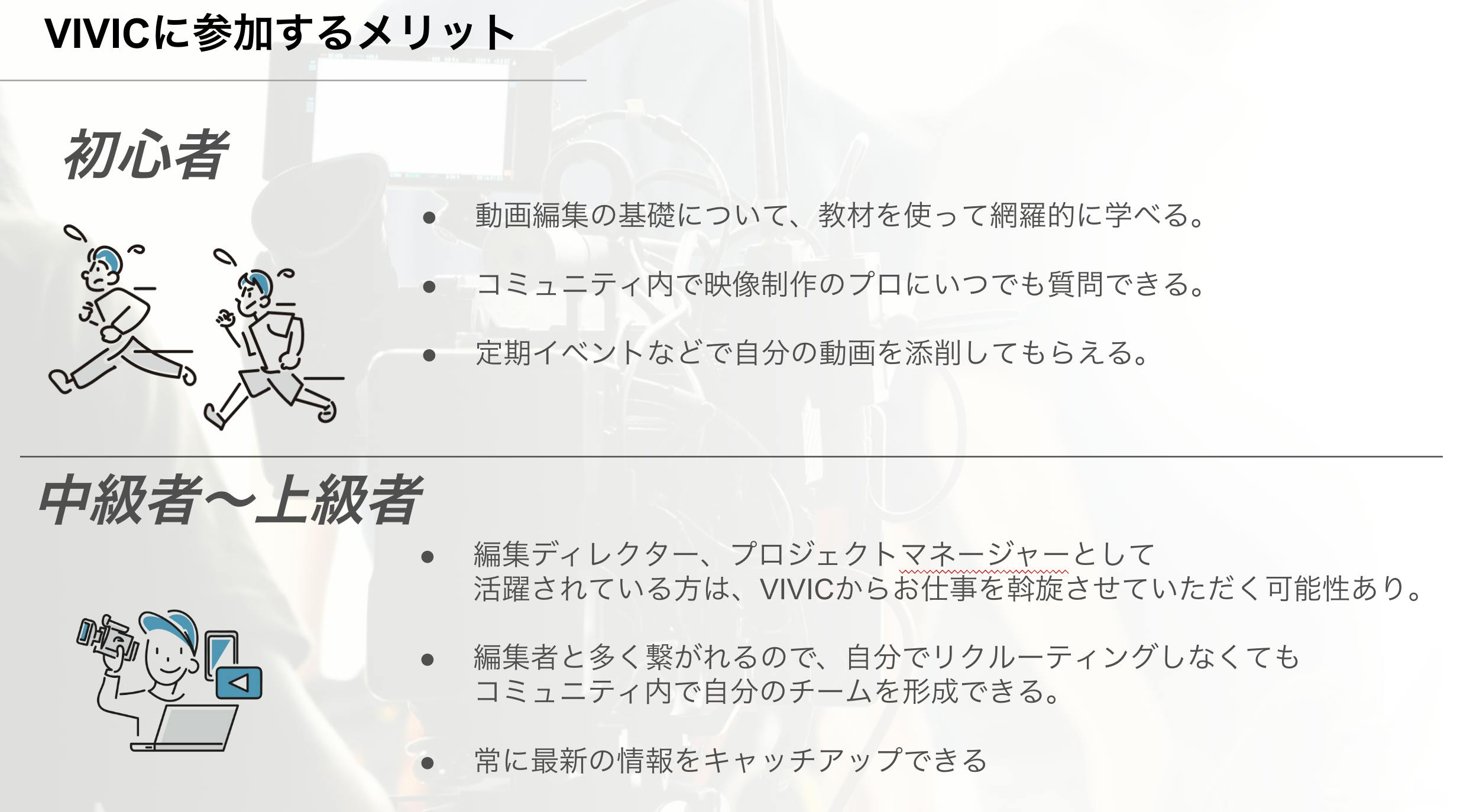 VIVICでは、「動画編集をとりあえず学んでみたい」という人から、「動画編集や映像制作をすでに仕事にしている人」まで、幅広く有益なコミュニティになる様に設計します。
