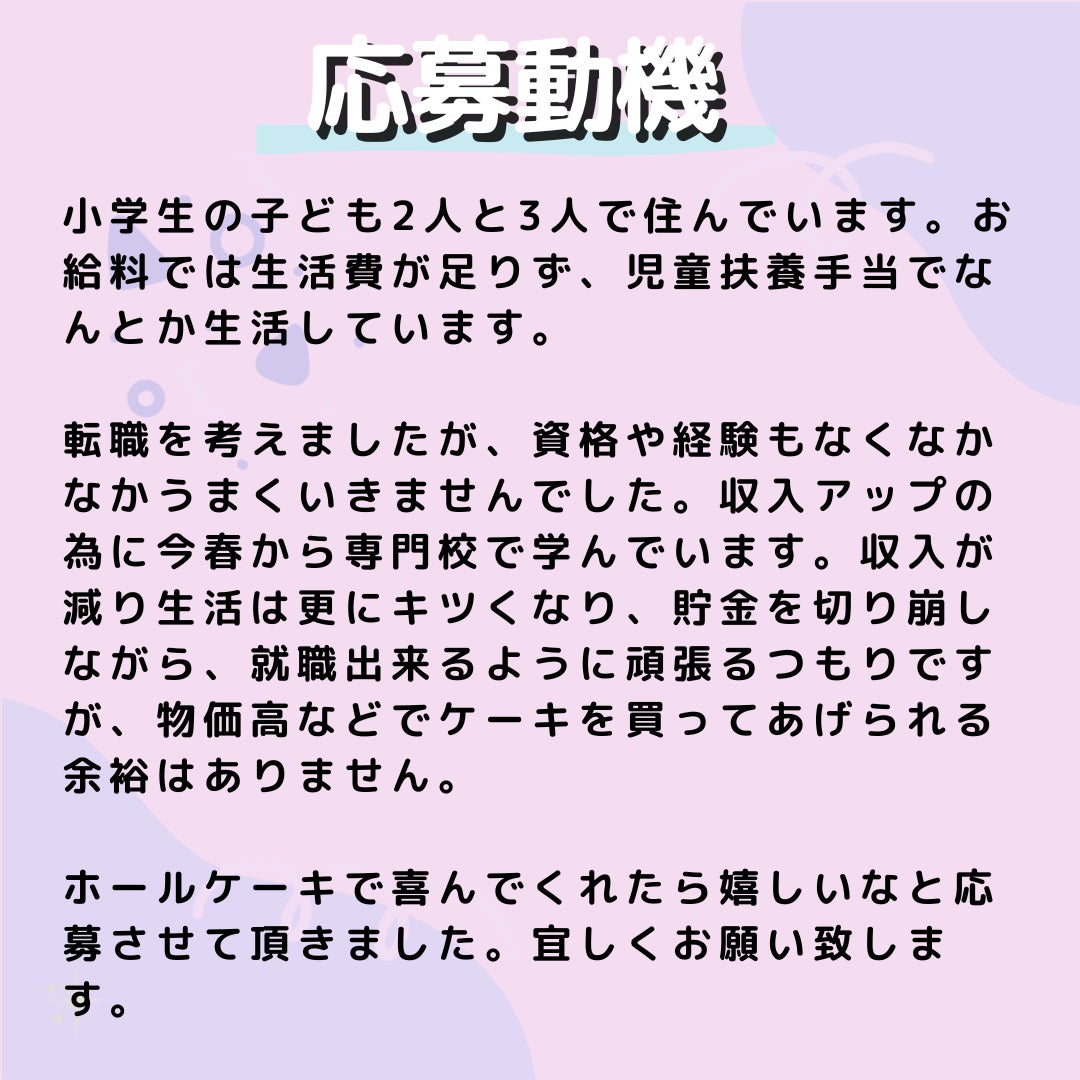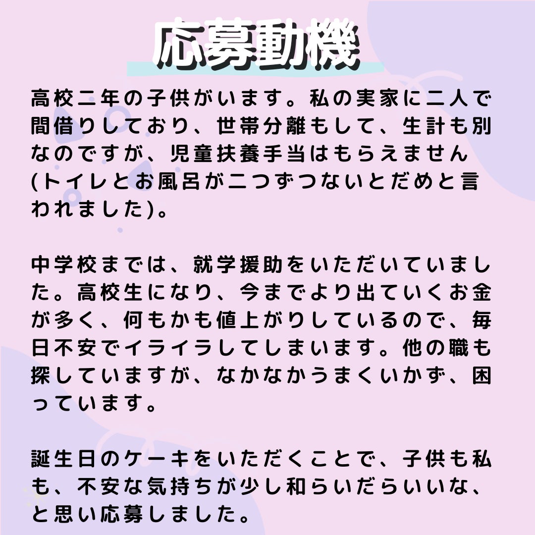 2025/08/11 10:19「この活動がコツコツと長く続いていて嬉しいです。一人でも多くの子供の楽しい時間が増えますように。」 クラウドファンディングの応援者からのメッセージを見たとき、思わず涙がこぼれました。 チャリティーサンタは名前の通り、出自はクリスマスから始まった活動です。クリスマスの困窮家庭の支援を始めたところ応募動機を読む中で、誕生日のニーズをいくつも手に取りました。 「クリスマスもですが、子どもの誕生日も諦めさせてます」 そんな声を読む中で、子どもにとって"自分が主役になれる日"を諦めているその事実に胸が締め付けられました。そんな時、「ケーキ屋として何か社会貢献活動できませんか・・・?」岡山にあるひとつのケーキ屋さんが声をかけてくれました。 「ケーキ屋さん・・・って誕生日のプロじゃないか!!!!」 私たちだけではできなかったことを一緒に協力してくれる相手が見つかって。やりたくてもできなかった"誕生日支援"についての光が見え、2021年よりテスト実施を行うことになりました。 それからは本当に、コツコツ、でした。 ただ、私が想像する以上に誕生日支援のニーズはあって。 支援を求める家庭の声が毎日届くようになりました。当初、寄付が十分に集められず期待をしてる家庭に落選通知をたくさん送った日。送信ボタンを押した瞬間のこと、今でも覚えています。 本当に苦しかった。 この家庭は二回、「子どもの誕生日をあきらめたくない」って気持ちを裏切られたんだ___くやしくて。 申し訳なくて。 でも、だからこそ"すべての子どもたち"を意識する瞬間でした。 そして、取り組みを続けていく中で、寄付者の皆様のおかげで支援の輪が広がり、声をかける家庭も増えていきました。コ ツコツ、の中に寄付をしてくださった方、それからあたたかく心を寄せてくださるケーキ屋さんがたくさんいます。 コツコツ、を支えてくださってありがとうございます。 本当に感謝してもしきれないです。 誕生日は、主役になれる日。 そして、子ども時代は限られている。 全ての子どもに「あなたが生まれてきてくれてうれしい」を伝えたい。 誕生日はだれにでもあるものだから。家庭にとっての支援の入り口になれるように。 あなたの温かいご支援が、困難を抱える子どもたちや保護者の心に、忘れられない思い出や希望を灯してくれています。クラウドファンディング終了まで残り13時間となりました。拡散・シェアなども大歓迎です。ぜひ、最後までよろしくお願いいたします! もっと見る
