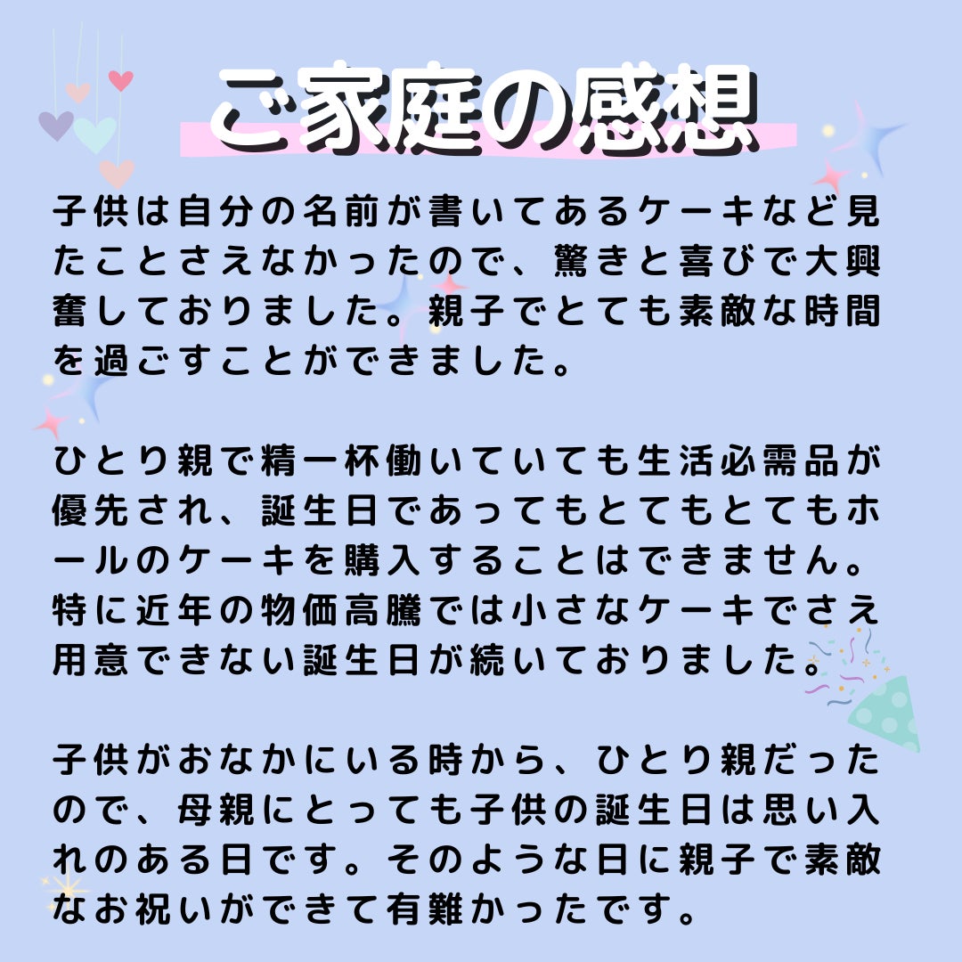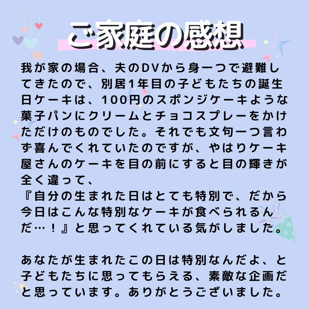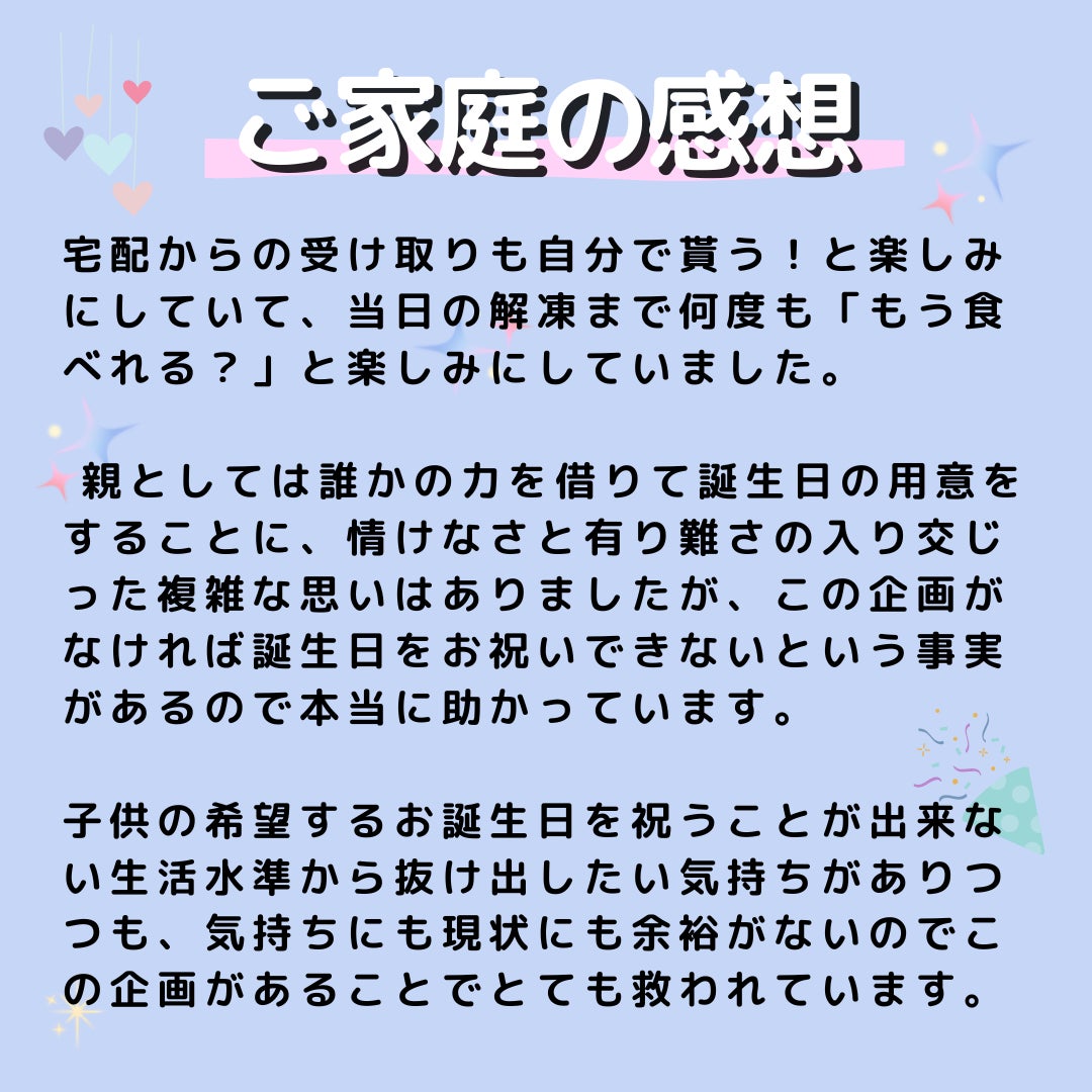 今まで多くの家庭からの声を聞く中で、「誕生日にお祝いをしてもらったことが、孤独感を少なくし、前をむくきっかけになった」という声も聞きました。