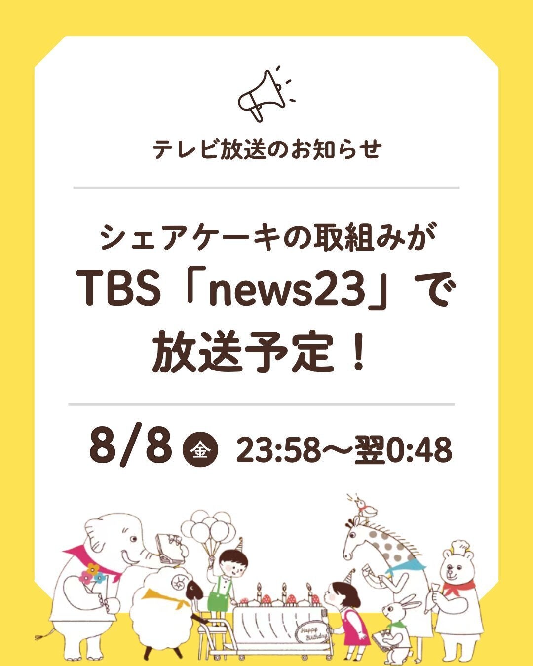 2025/08/07 20:00いつもチャリティーサンタの活動を応援していただき、ありがとうございます!今回は、嬉しいニュースです♪===テレビ放送のお知らせ===シェアケーキの取組がTBS「news23」で8月8日(金)放送予定! ケーキが贈られるご家族の声、ケーキのWAプロジェクトの村上信五リーダーのインタビュー等が紹介される予定です。 皆様ぜひご覧ください。放送日時: 8月8日(金)23:58〜翌0:48※緊急のニュース等が入った場合、放送の予定が変更になる可能性がありますのであらかじめご了承ください。遅い時間帯になりますが、皆様ぜひご覧ください◎そしてより多くの方に届きますように、拡散や口コミなど大歓迎です!クラウドファンディングも8/11(月祝)まで誕生日のお祝いを諦めたくない親子へ。1万人に #シェアケーキを届けたい! もっと見る