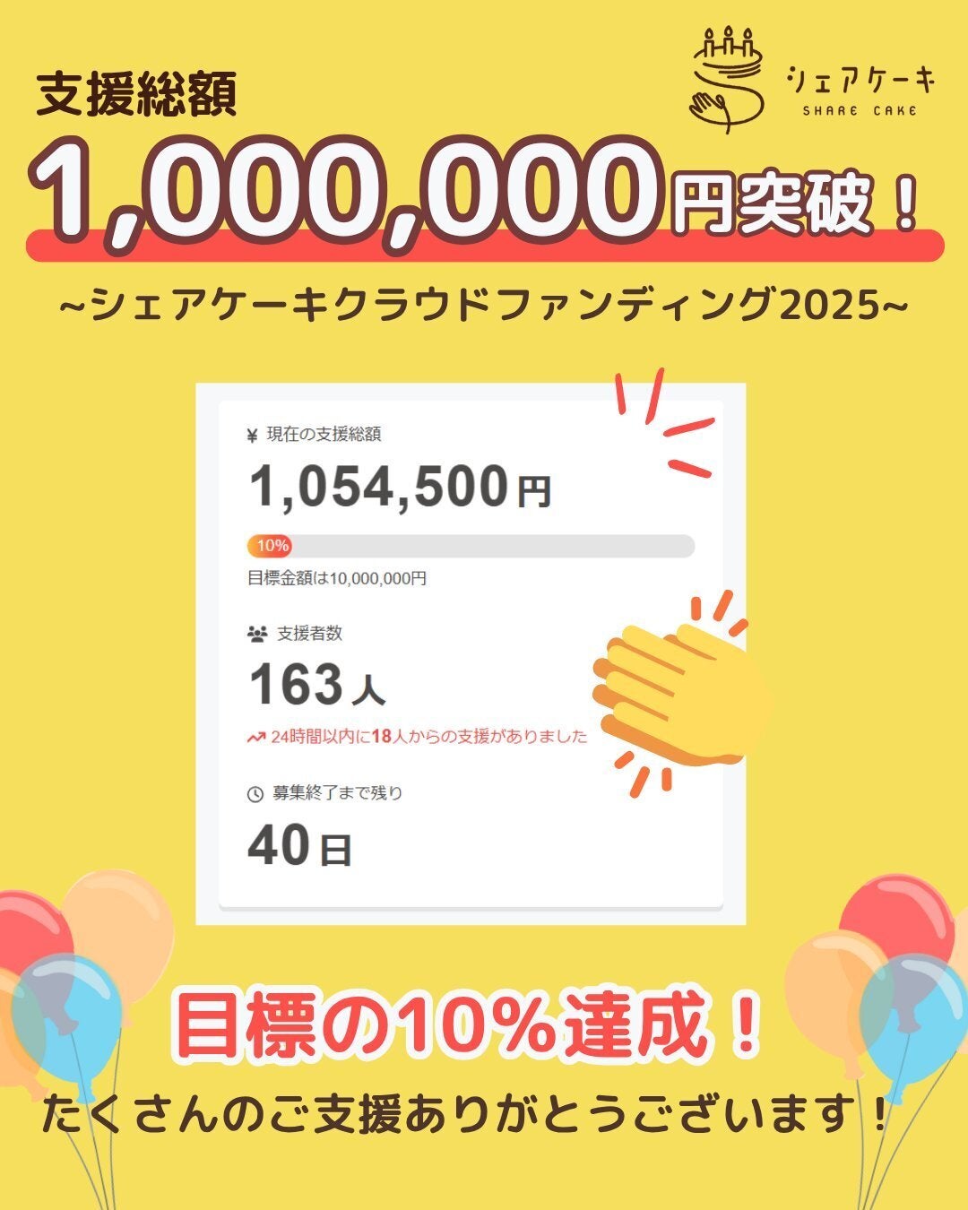 プロジェクト公開から1週間で、 #シェアケーキ クラウドファンディングの支援額が1,000,000円(10%)を超えました!