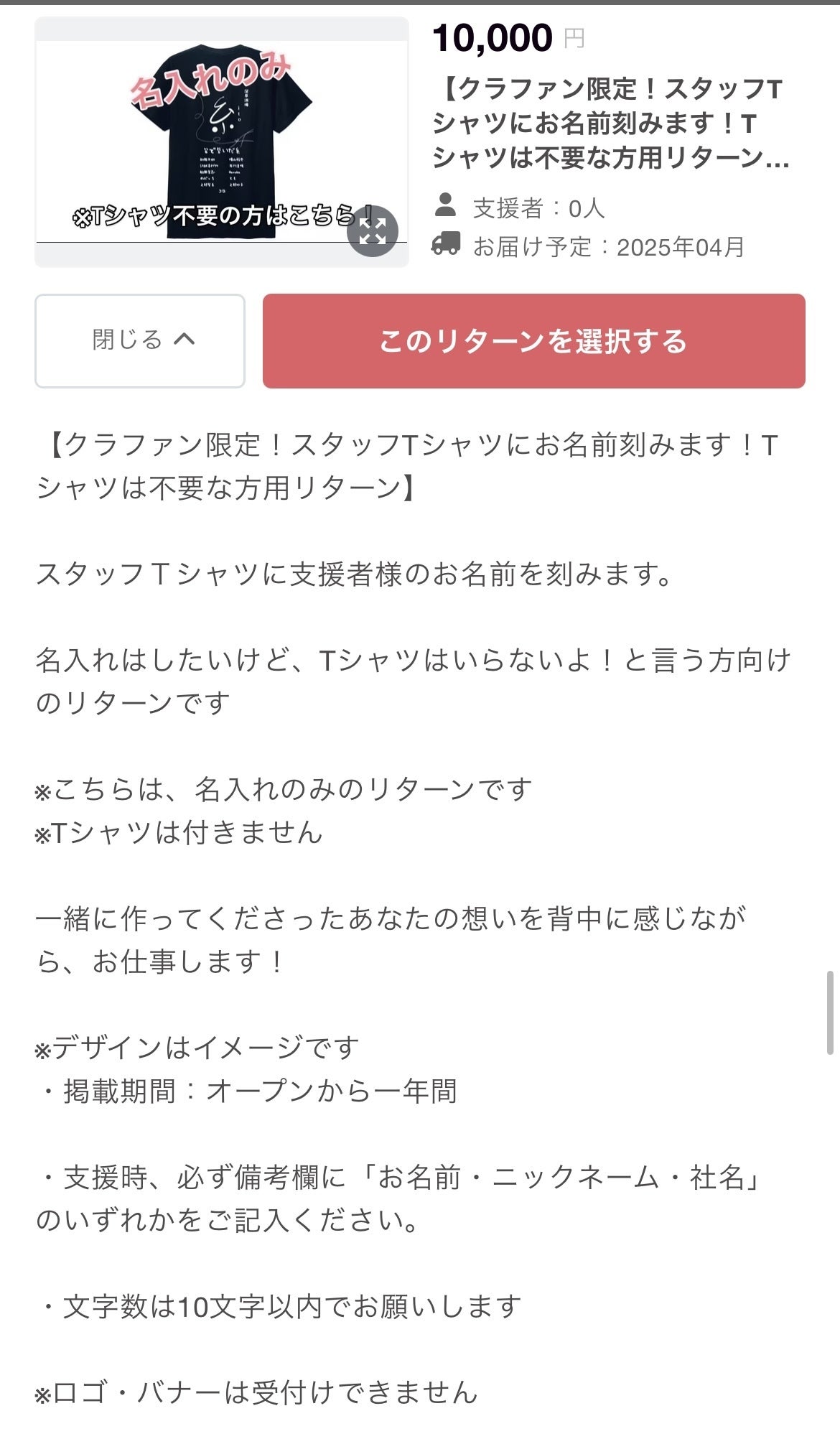 名入れのみ、Tシャツの現物は不要!という方向けのリターンです!