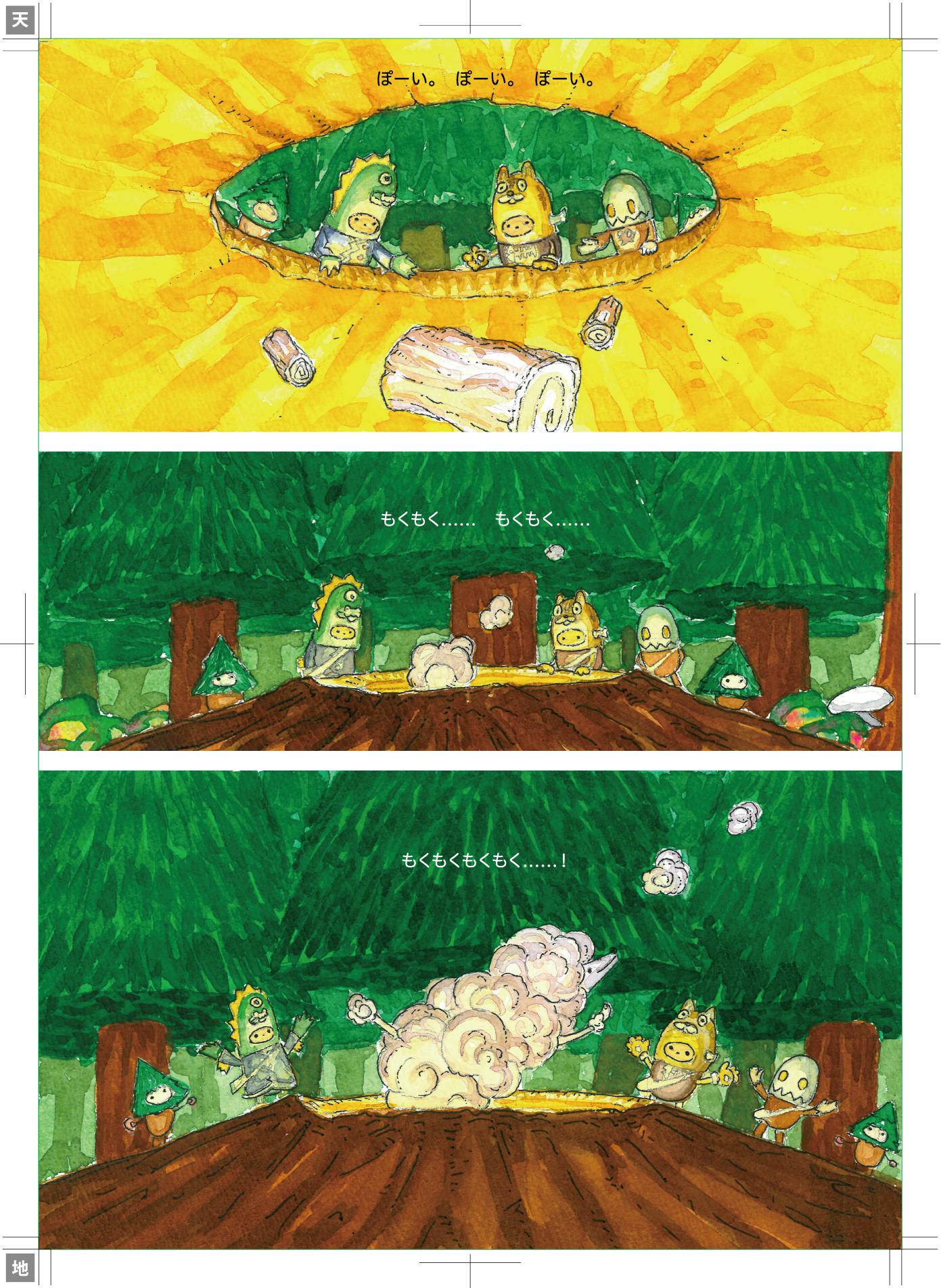 一枚の絵画として制作し発表する中で、多くの方から絵本にすることやストーリーを付けることへのリクエストやアドバイスをいただき、今回はその冒険絵画シリーズの中に度々出てきたキャラクター”レンレン”を中心とした新しい物語を36ページにわたる絵本『おいわいのぼうけん』として発表することになりました。