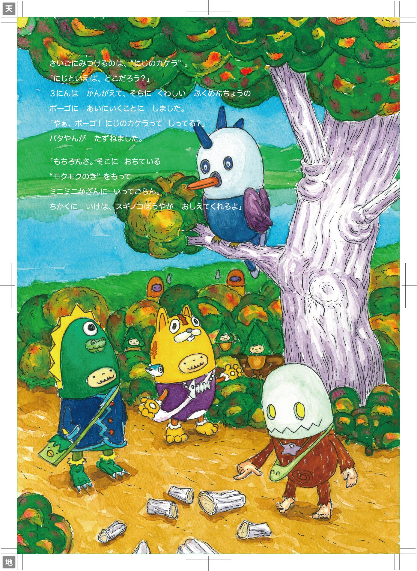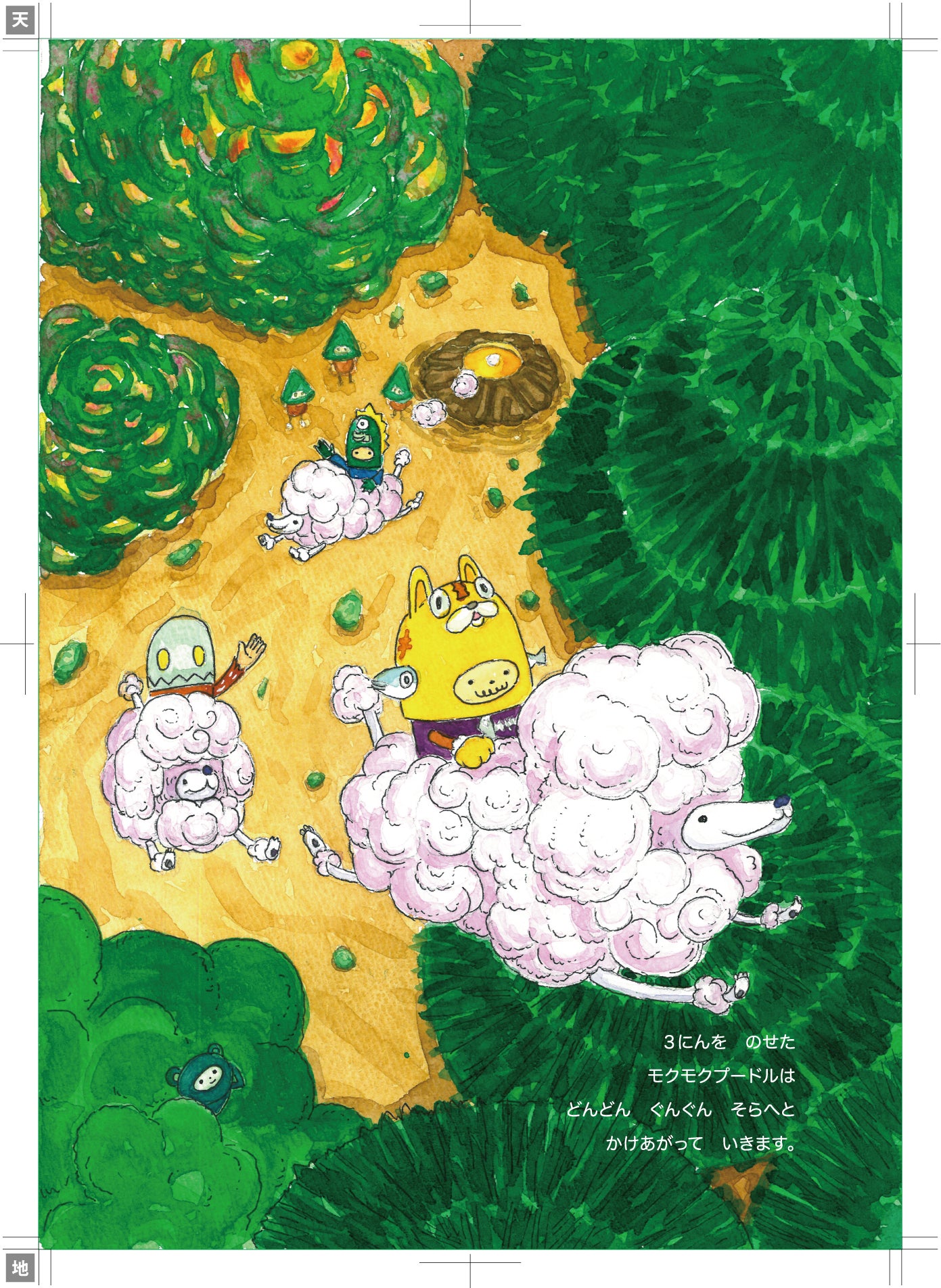 一枚の絵画として制作し発表する中で、多くの方から絵本にすることやストーリーを付けることへのリクエストやアドバイスをいただき、今回はその冒険絵画シリーズの中に度々出てきたキャラクター”レンレン”を中心とした新しい物語を36ページにわたる絵本『おいわいのぼうけん』として発表することになりました。