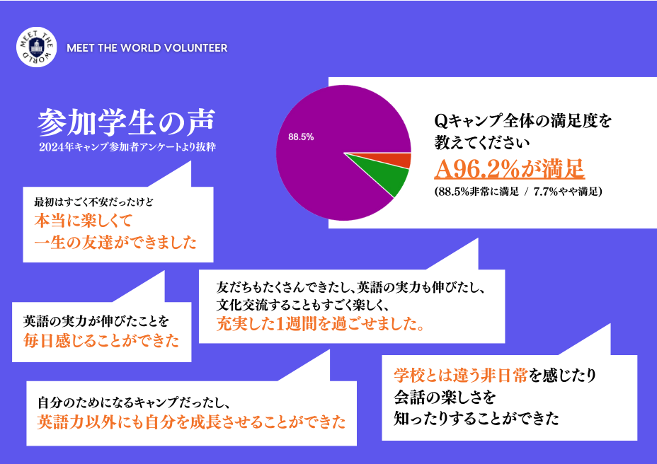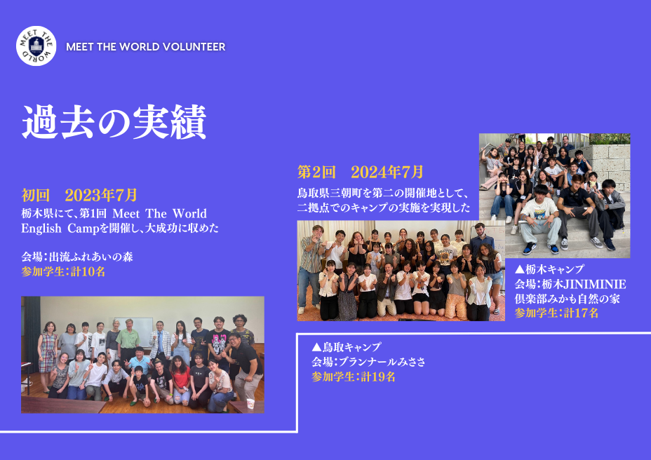 2023 年 5 月の設立以降、「地方から世界へ!」をテーマに、英語学習と国際交流を融合した特別なキャンプを開催してきました。記念すべき第 1 回目は 2023 年 7 月に実施され、今年の夏には早くも第 3 回を迎えます。