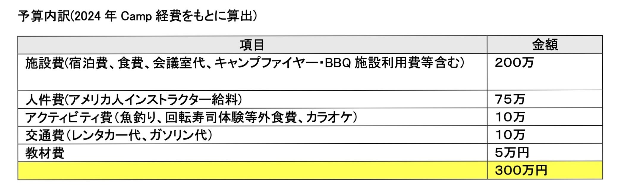 今年のキャンプにかかる費用の見積もりは以下の通りです。