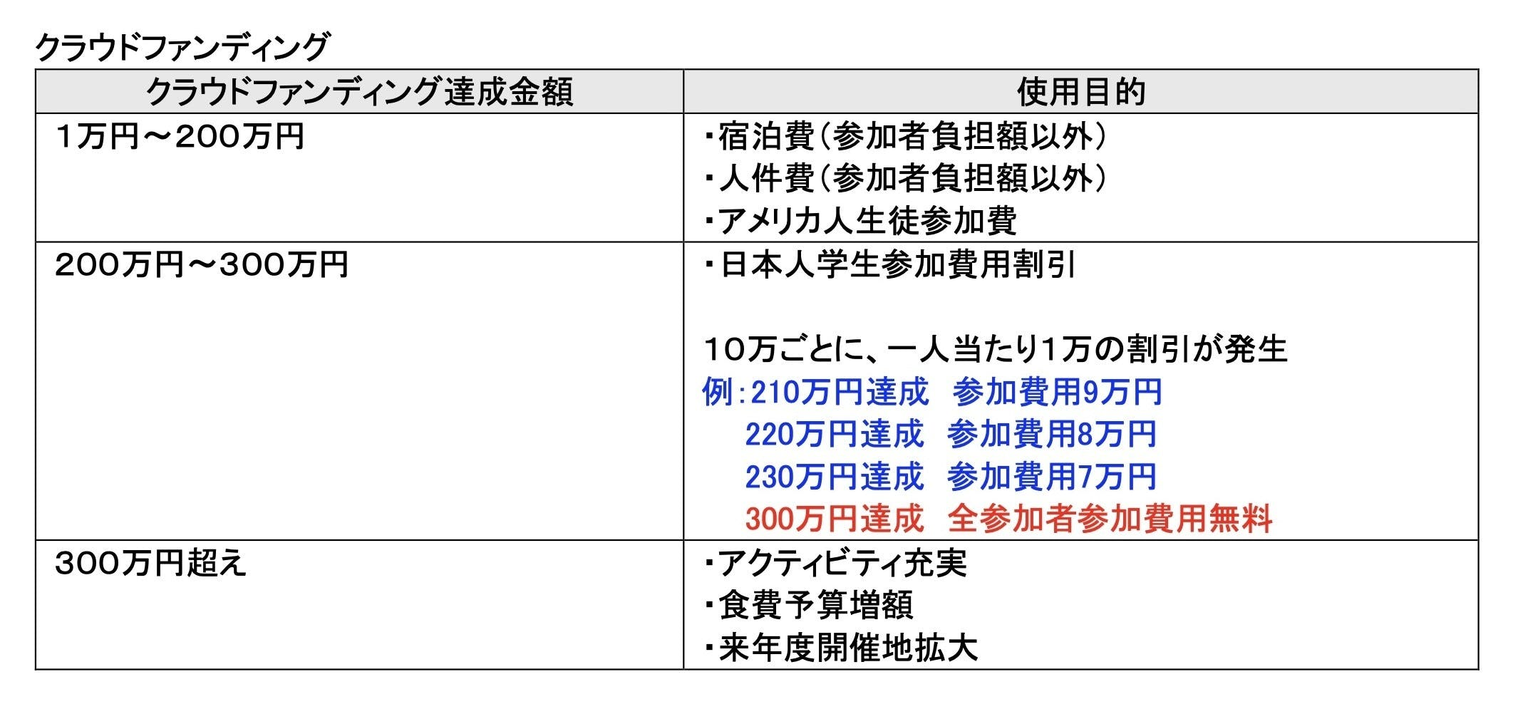 目標のクラウドファンディング 300 万円を達成した際には、今年参加する高校生全員を無料でキャンプに招待することをお約束します。